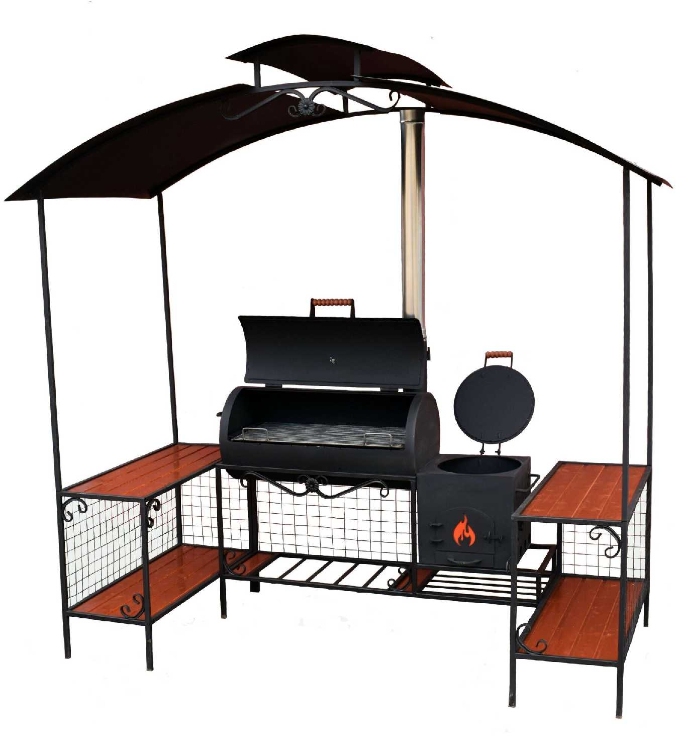 Особенности : | колёса, крыша, крышка, переносной, поддон для сбора жира, разборный, решетка, термометр |