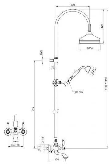 | Дополнительная информация : | высота стойки для душа: 1445 мм, диаметр душевой лейки: 75 мм, диаметр верхнего душа: 200 мм |