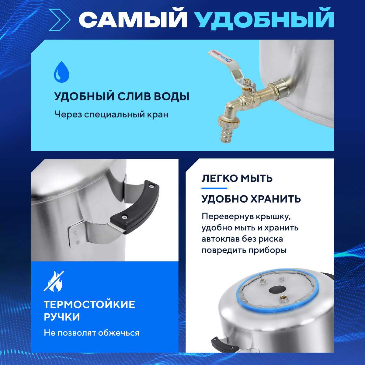 Безопасность и потенциальные проблемы: Система безопасности автоклава включает предохранительный клапан, настроенный на срабатывание при давлении около 1.2 бар, что является стандартным механизмом предотвращения аварийных ситуаций, связанных с избыточным давлением внутри емкости. Наиболее часто встречающейся проблемой, затрагивающей безопасность и удобство, является некорректная работа основного клапана, который не закрывается автоматически после сброса давления и требует ручного вмешательства, что может вызывать затруднения у новичков и потенциально привести к ошибкам. Некоторые пользователи сообщают о нештатных ситуациях, таких как деформация дна ("дно стало более выпуклым") и громкие щелчки при нагреве, что требует внимания и проверки целостности аппарата перед каждым использованием для исключения рисков. Острые кромки на горловине и деталях фальшдна представляют собой прямую опасность получения порезов во время мойки и обслуживания, что указывает на недостаток финишной обработки деталей на производстве. Важным требованием безопасности является постоянный контроль уровня воды в баке при использовании ТЭНа для предотвращения его перегрева и выхода из строя, что особо подчеркивается в отзывах опытных пользователей. Несмотря на отдельные замечания, общий уровень безопасности аппарата при правильной эксплуатации и соблюдении инструкции оценивается как высокий, что подтверждается многократным успешным использованием для приготовления разнообразных консервов.