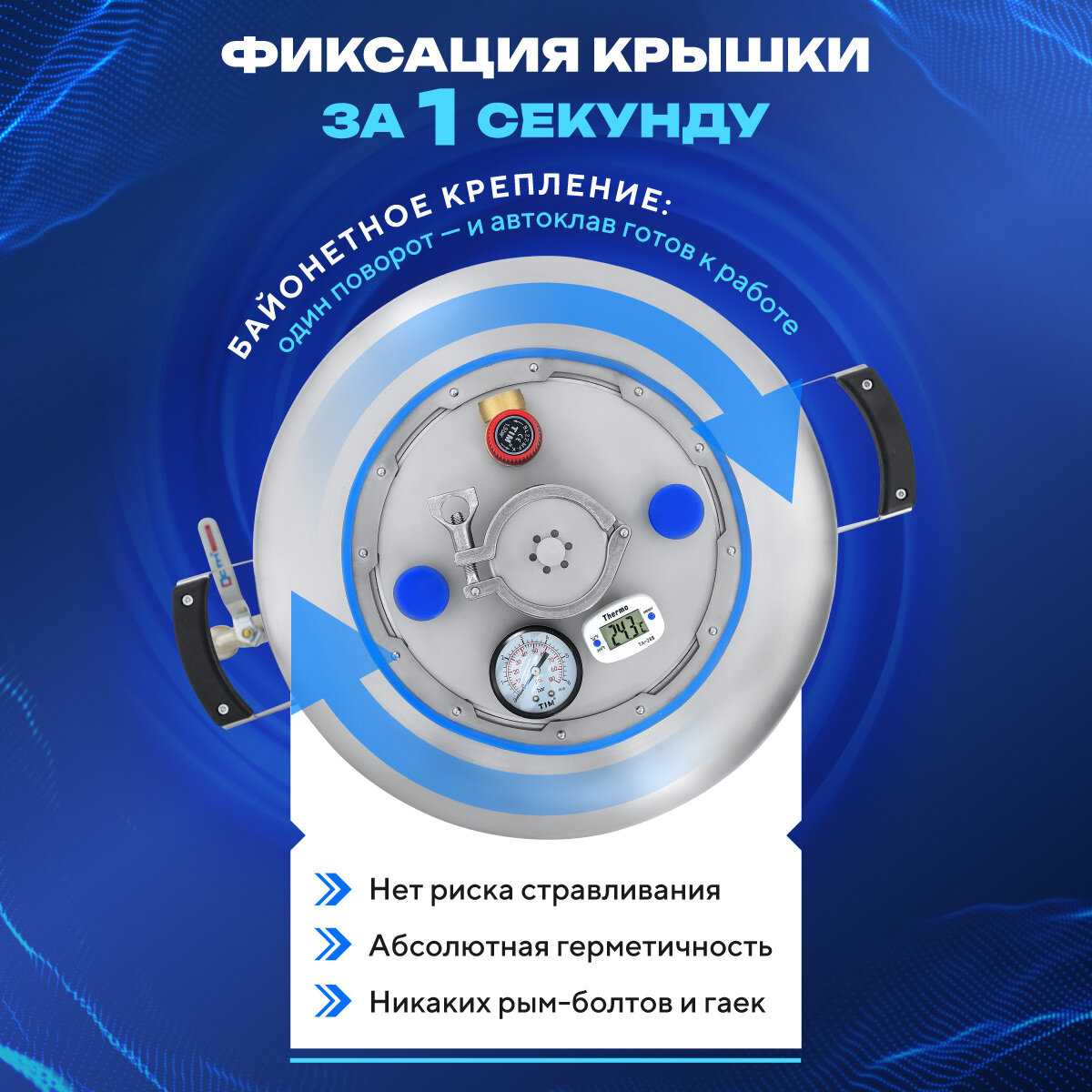 - Байонетный механизм фиксации обеспечивает равномерное прилегание крышки по всему периметру, что гарантирует полную герметичность рабочей камеры при повышении давления до 1.5 атм.