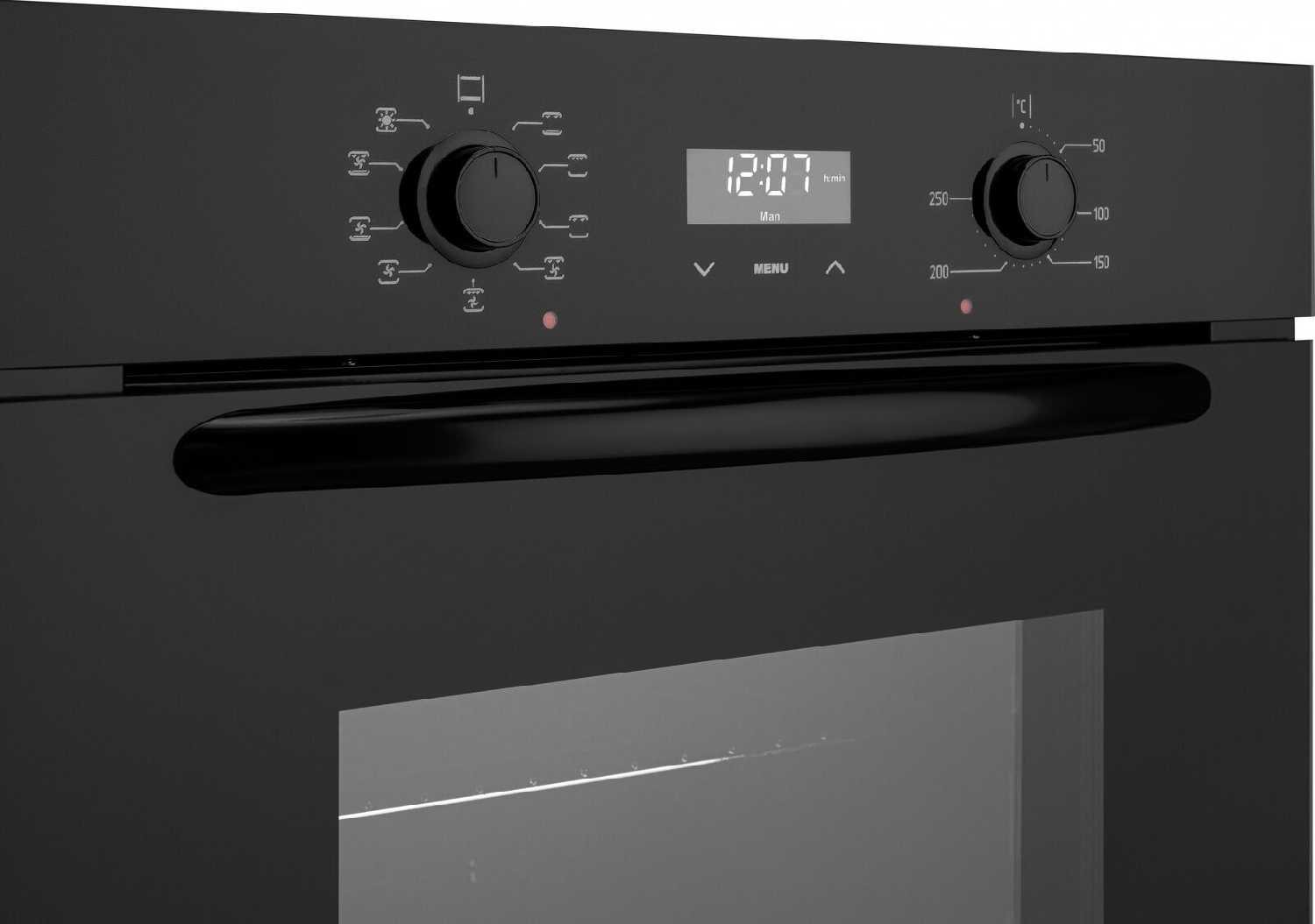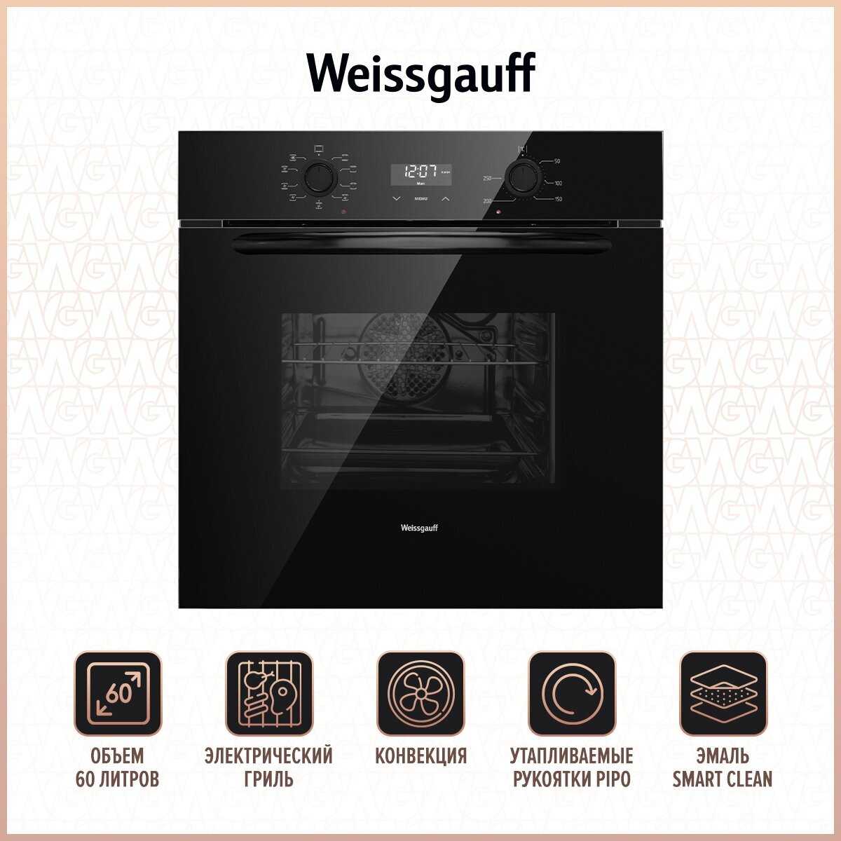 - Вентилятор обеспечивает циркуляцию горячего воздуха для одновременного запекания блюд на разных уровнях.