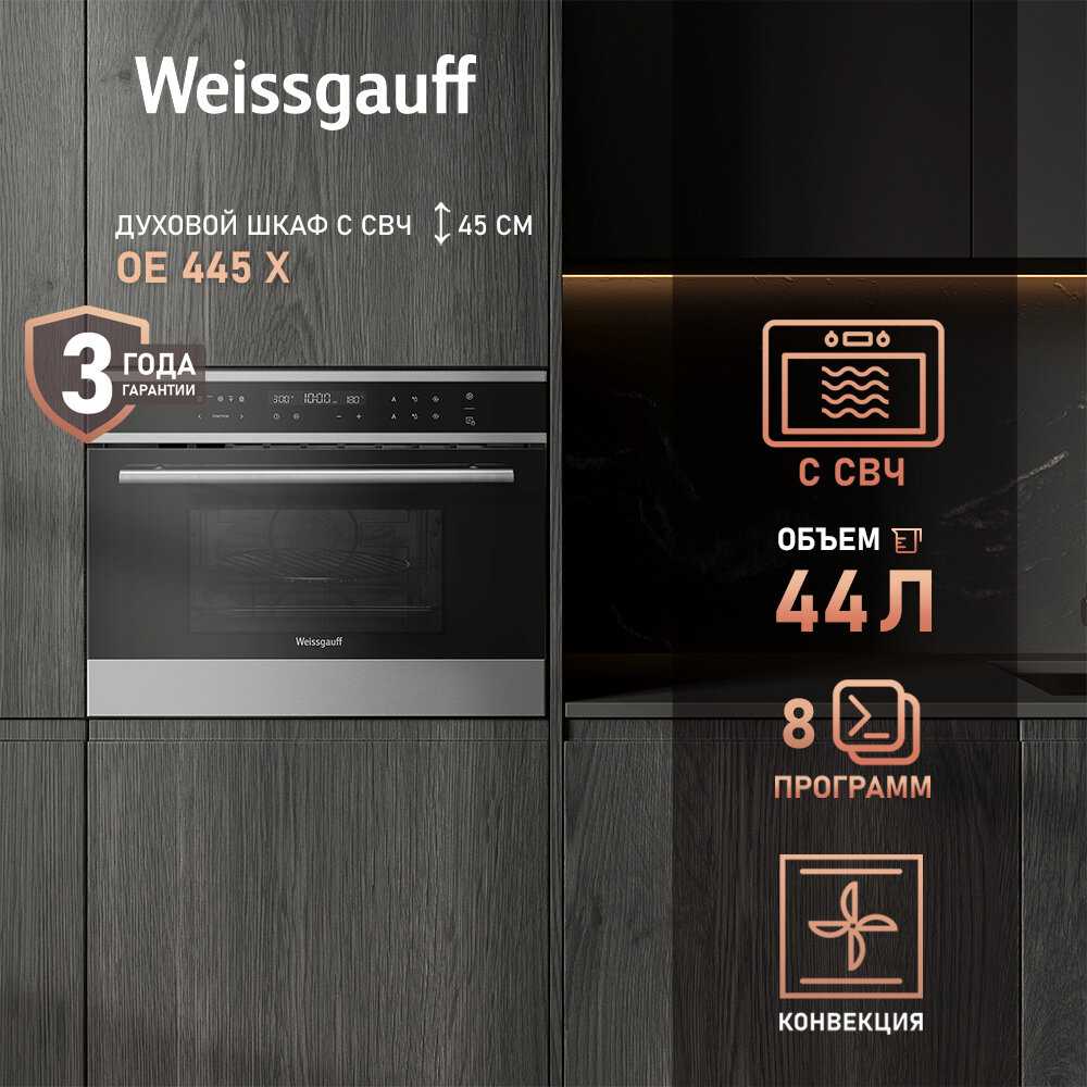 Weissgauff 445 X выигрывает у Gorenje BOP645S314X и Beko BIM22300X по компактности (44 л vs 66-77 л) для крошечных ниш, где стандартные шкафы не встают. Уступает Hotpoint-Ariston F069 IX HA и Indesit I6VH2A X по прочности противня и равномерности пропека выпечки без доработок режимов. Candy FCPM815XL предлагает самоочистку, которой нет у анализируемой модели, но тяжелее в установке. Для мини-кухонь без сложной кондитерки подойдет Weissgauff как 2в1 решение; при частой выпечке или большом объеме лучше Hotpoint-Ariston или Gorenje.
