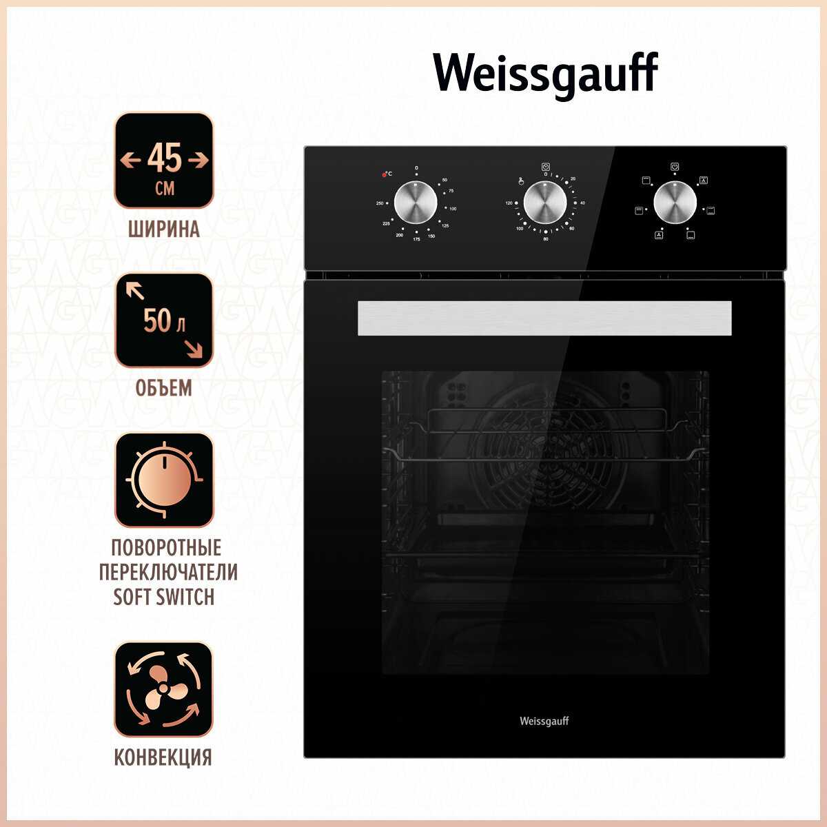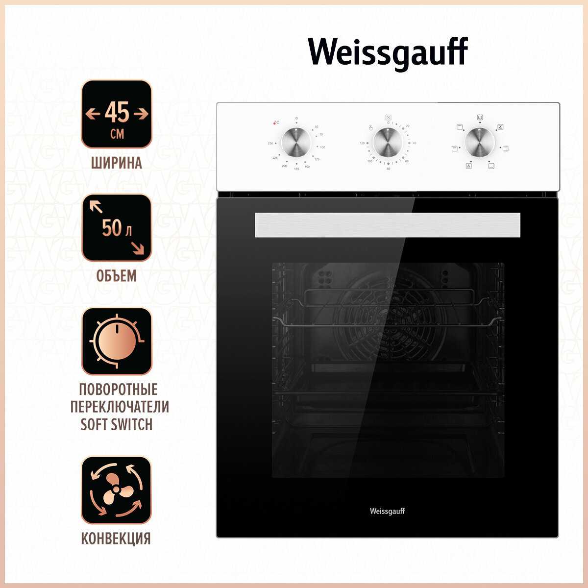 Духовка выпускается в классических цветах (белый, чёрный, нержавеющая сталь) с ретро-элементами: рифлёные ручки, аналоговые переключатели "под часы". Она гармонично сочетается с кухнями в стиле кантри или ретро, особенно при комплектации с другой техникой Weissgauff 45 см. -