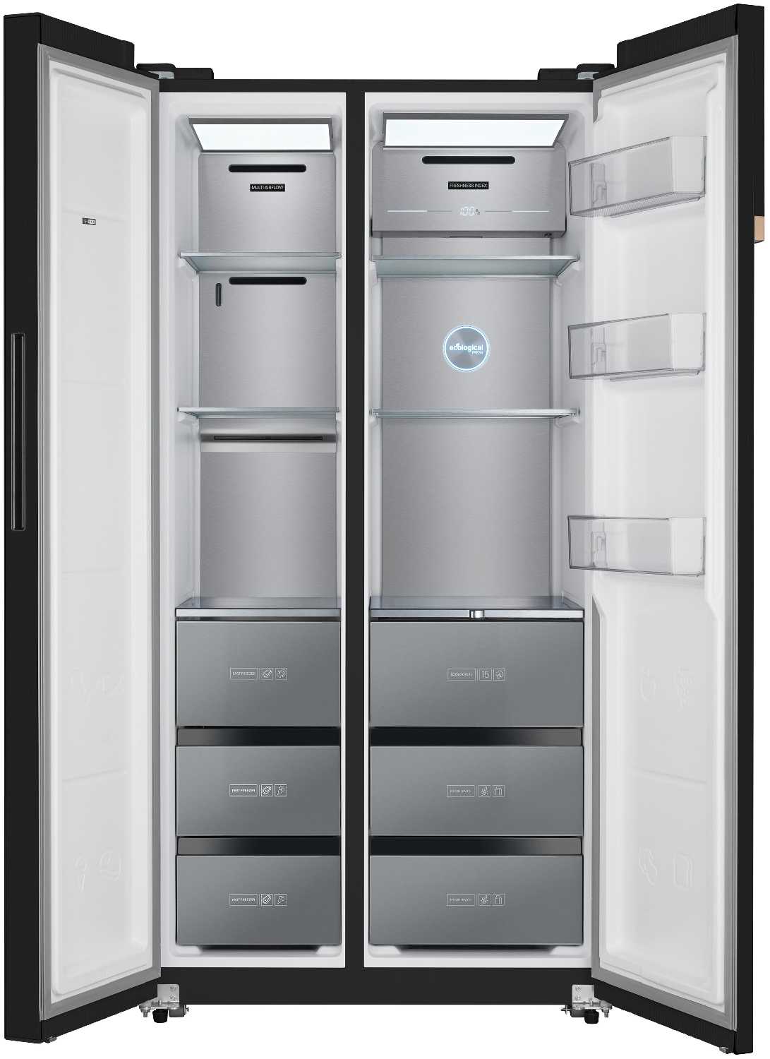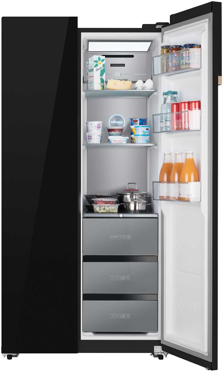 - Выдвижные ящики морозилки с доводчиками плавно закрываются даже при заполнении на 90%.