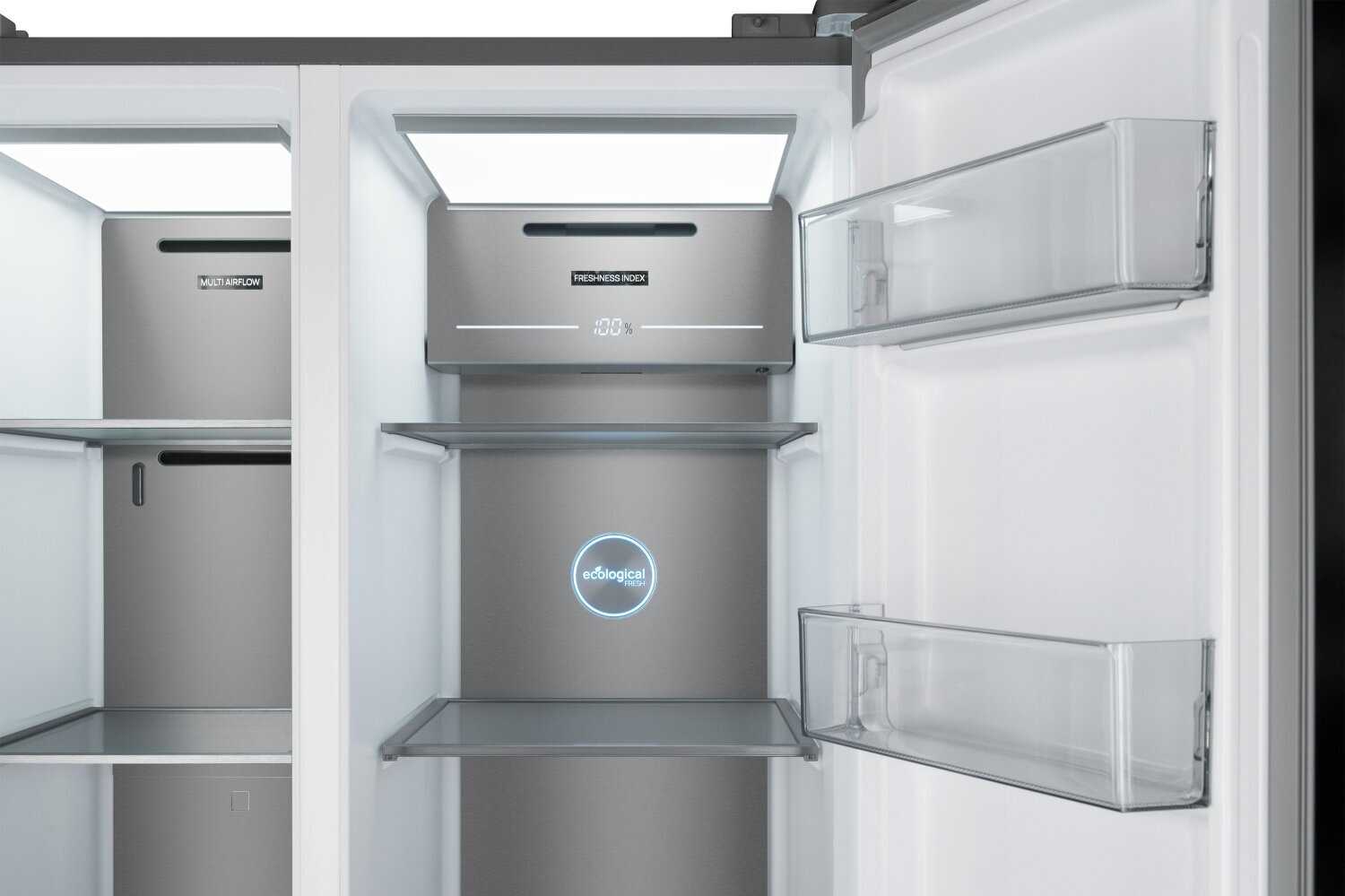 - Инверторный компрессор обеспечивает быстрое достижение заданной температуры (-24°C в морозилке, 0°C в зоне свежести) и снижает энергопотребление.