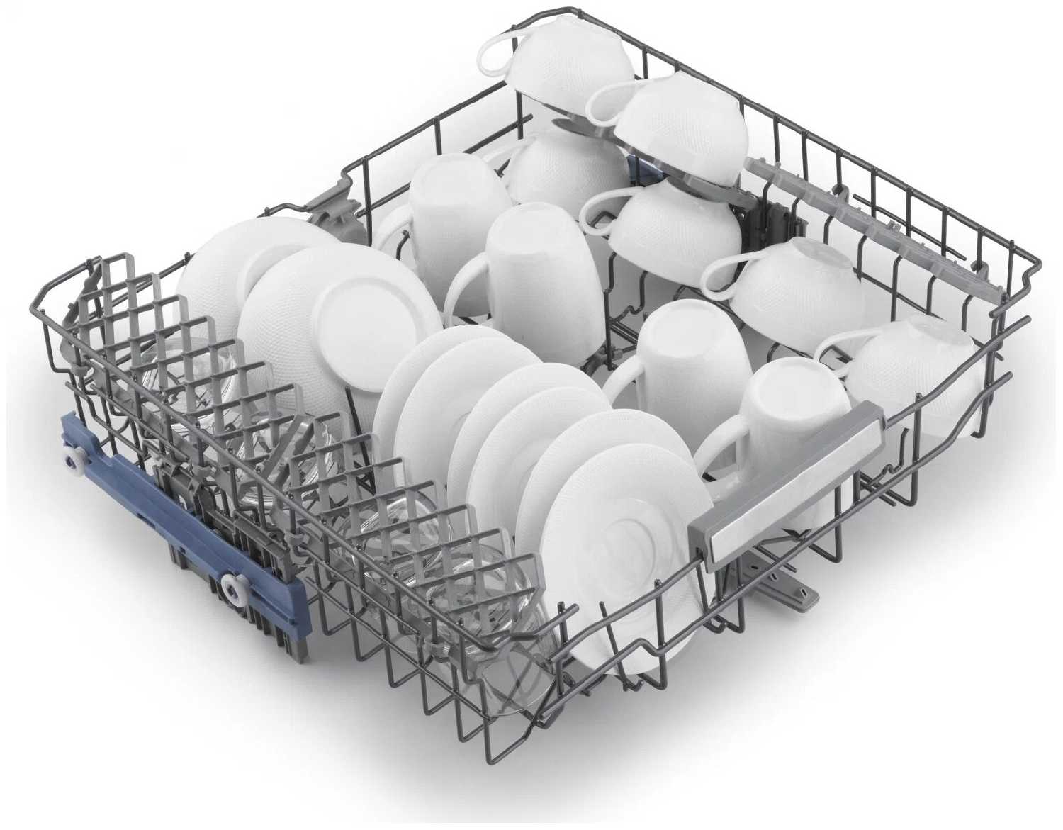 - + Недорогая, хорошо моет, сносно сушит, третий лоток для столовых приборов