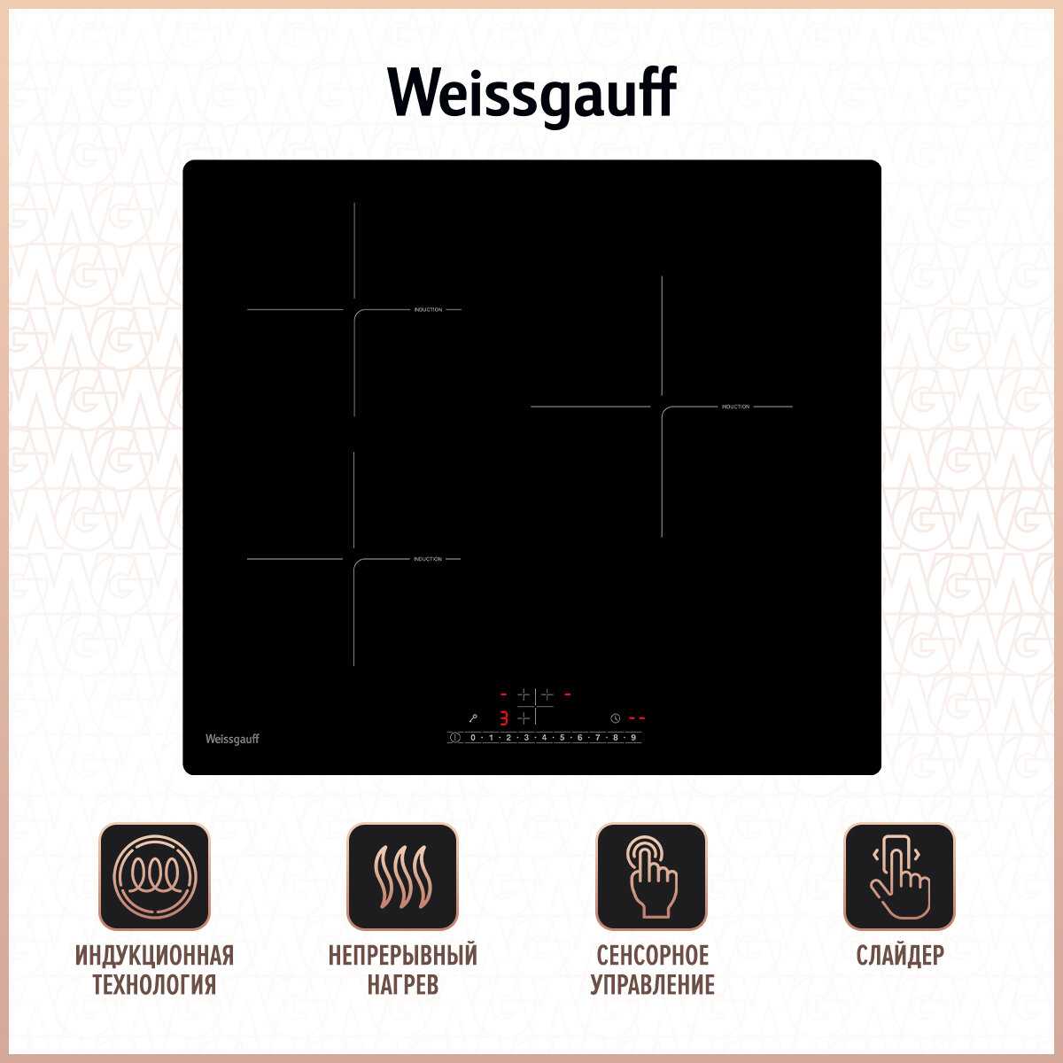 - Интуитивная индикация активных конфорок и уровня нагрева на дисплее.
