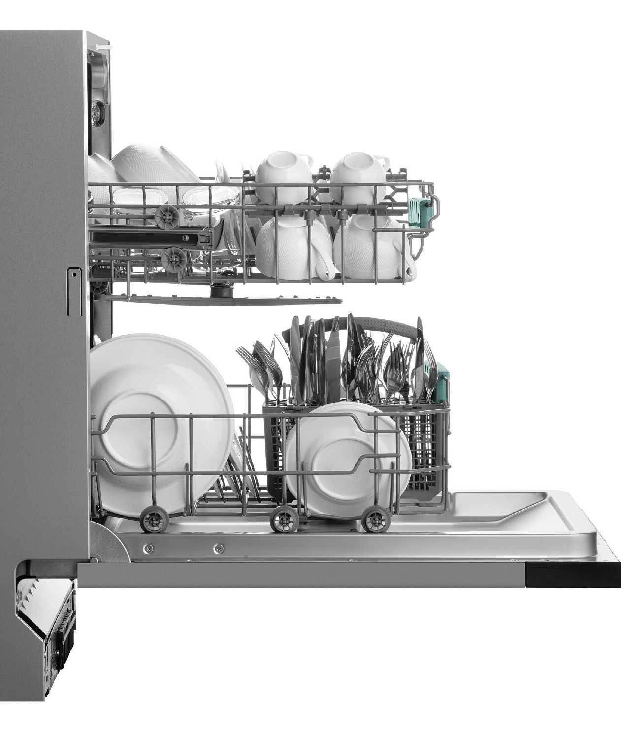 Довольно вместительная и есть звуки окончания работы, очень не хватало в прошлой встроенной посудомоечной, когда не видишь как идет процесс - - Не понравилось, что есть только одна полка для условных ножей и держится она довольно хлипко