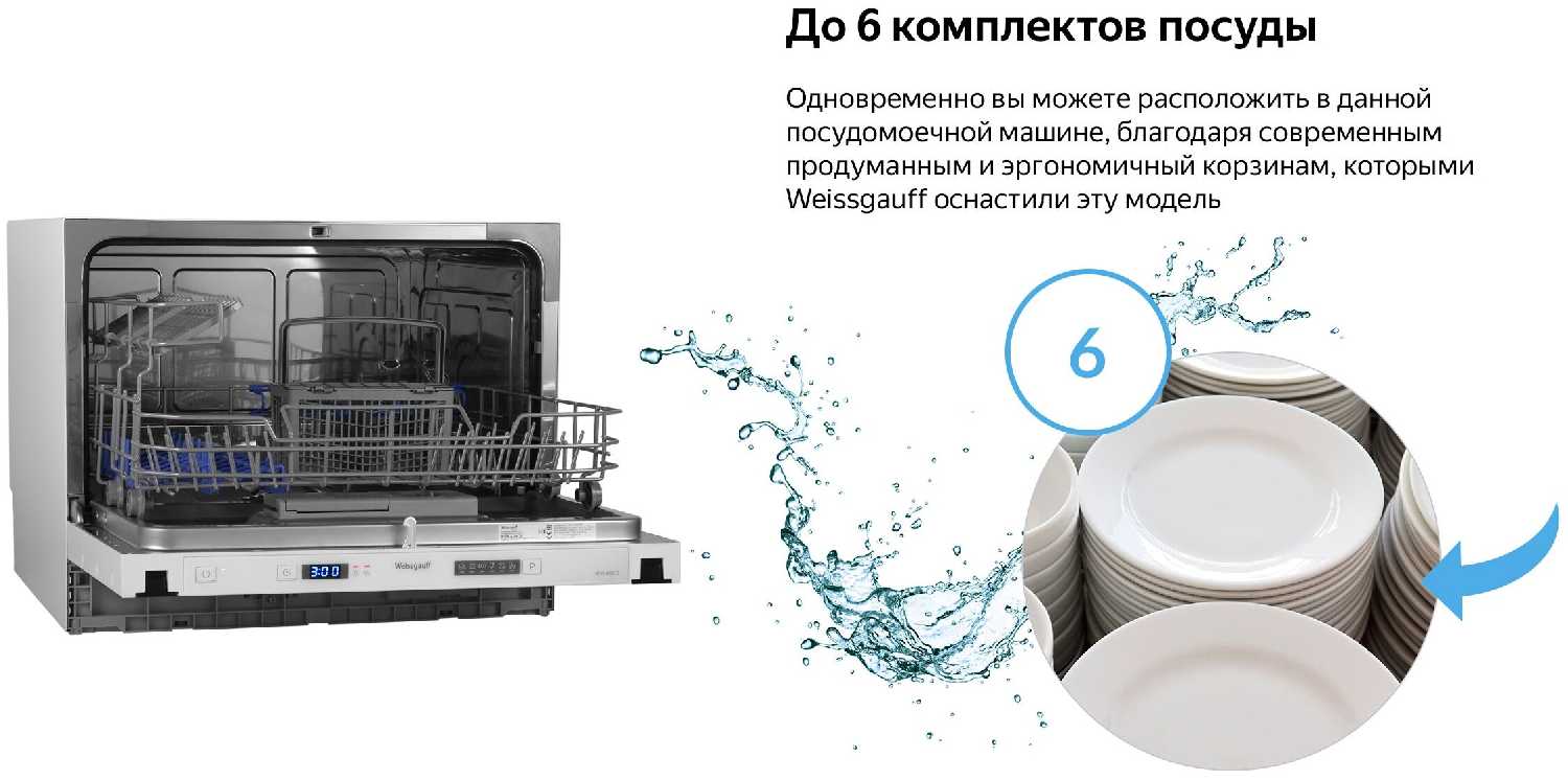 - Несмотря на малые габариты, машинка вмещает до 6 комплектов посуды, включая небольшие кастрюли и сковородки, при правильной расстановке.