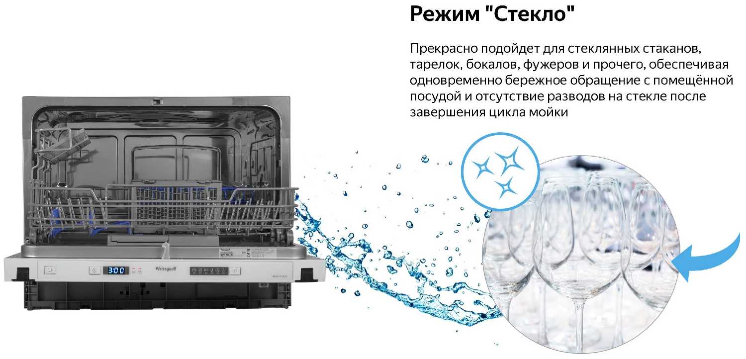 - Режим для стекла обеспечивает бережную мойку хрупких предметов, что подтверждается отсутствием повреждений после многократного использования.