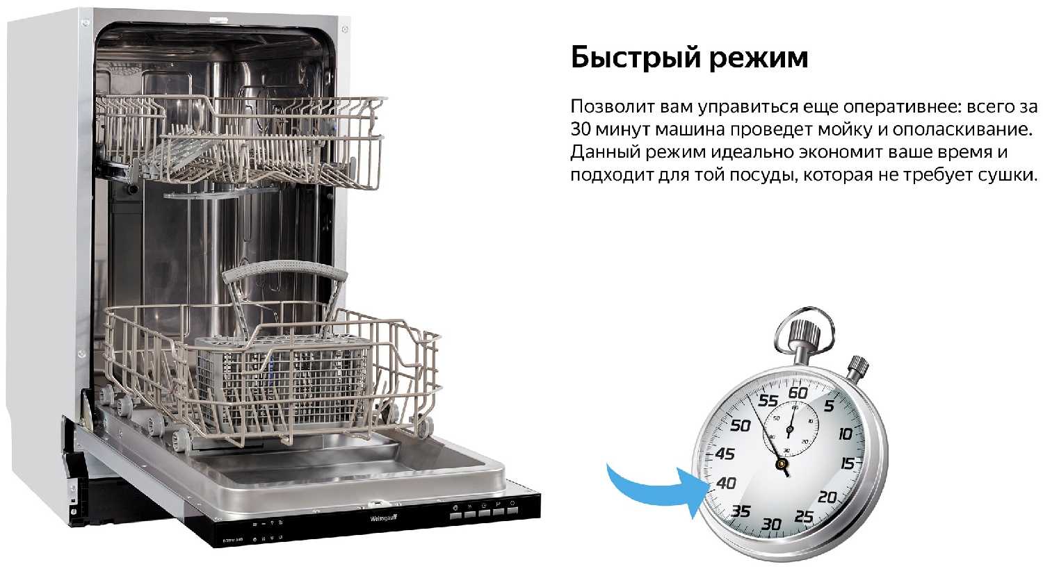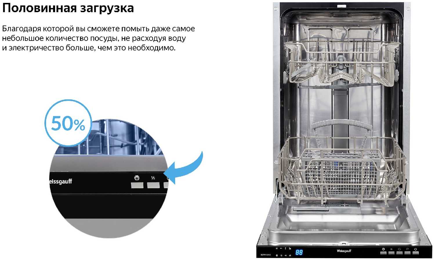 - Половинная загрузка сокращает расход воды до 7 л при сохранении качества мытья.