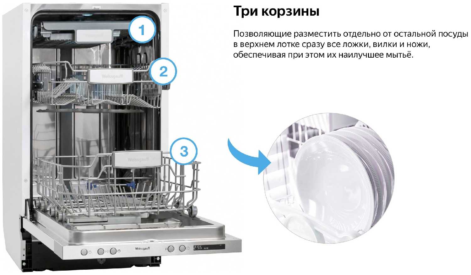 5.Понравилась внутренняя эргономика, все корзины очень удобные и вместительные, кастрюли, огромные тарелки,блюда,влезет всё)) Очень удобная отдельная корзинка для столовых приборов,аккуратно все разложил и готово. - - Т.к. вода в нашем район очень жёсткая,пришлось повозиться с настройкой перед и после мойки. Несколько раз на посуде оставались следы,хотя по исходной инструкции все сделали правильно. Но в конечном итоге после внимательной настройки все получилось. Так что это не какой-нибудь недостаток,просто думали будет проще и сразу все с первой мойки получиться))
