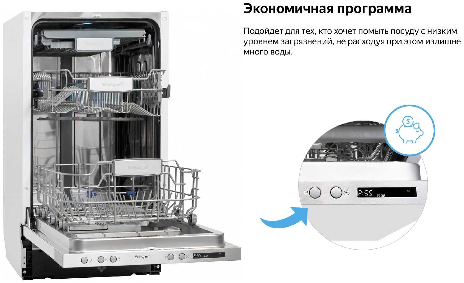 Отличная посудомойка для 45см,очень вместительная,если грамотно все сложить. Особенно нравится что есть отдельная полка для столовых приборов(у родителей в электролюксе стакан и промываются плохо). А так как в городе мягкая вода,то с солью особо не заморачиваться,установили режим с минимальным расходом и раз в месяц смотрю и подсыпаю ее по немногу. Посуда всегда чистая и блестит(очень многое зависит от моющего средства,тк был опыт неудачных таблеток,после которых посуда была жирнее,чем ее туда поставили в грязном виде). Я очень довольна.