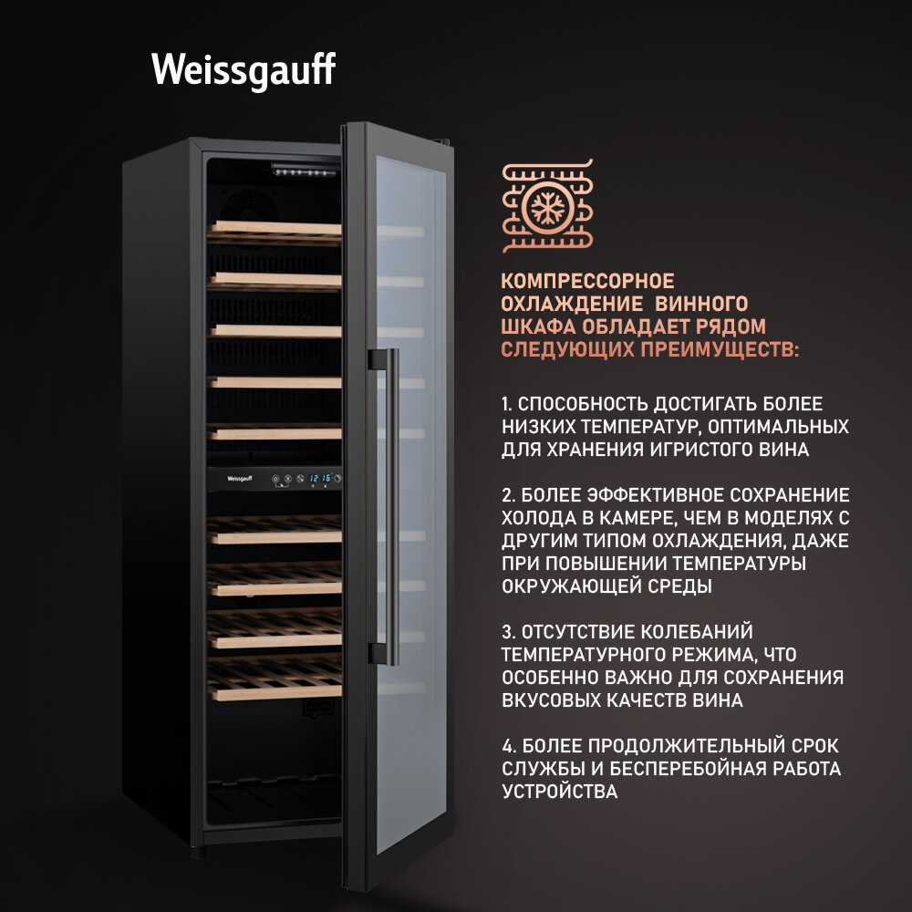 - + Винный холодильник Weissgauff WWC-77 DB DualZone получил, всё в порядке, работает уже с полгода хорошо. Только вместимость холодильника не 77 бутылок, а 55 обычных винных бутылок.