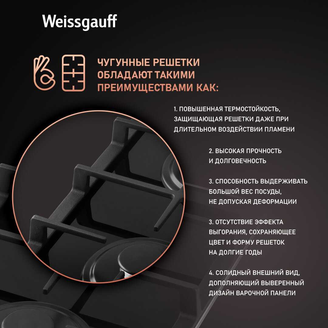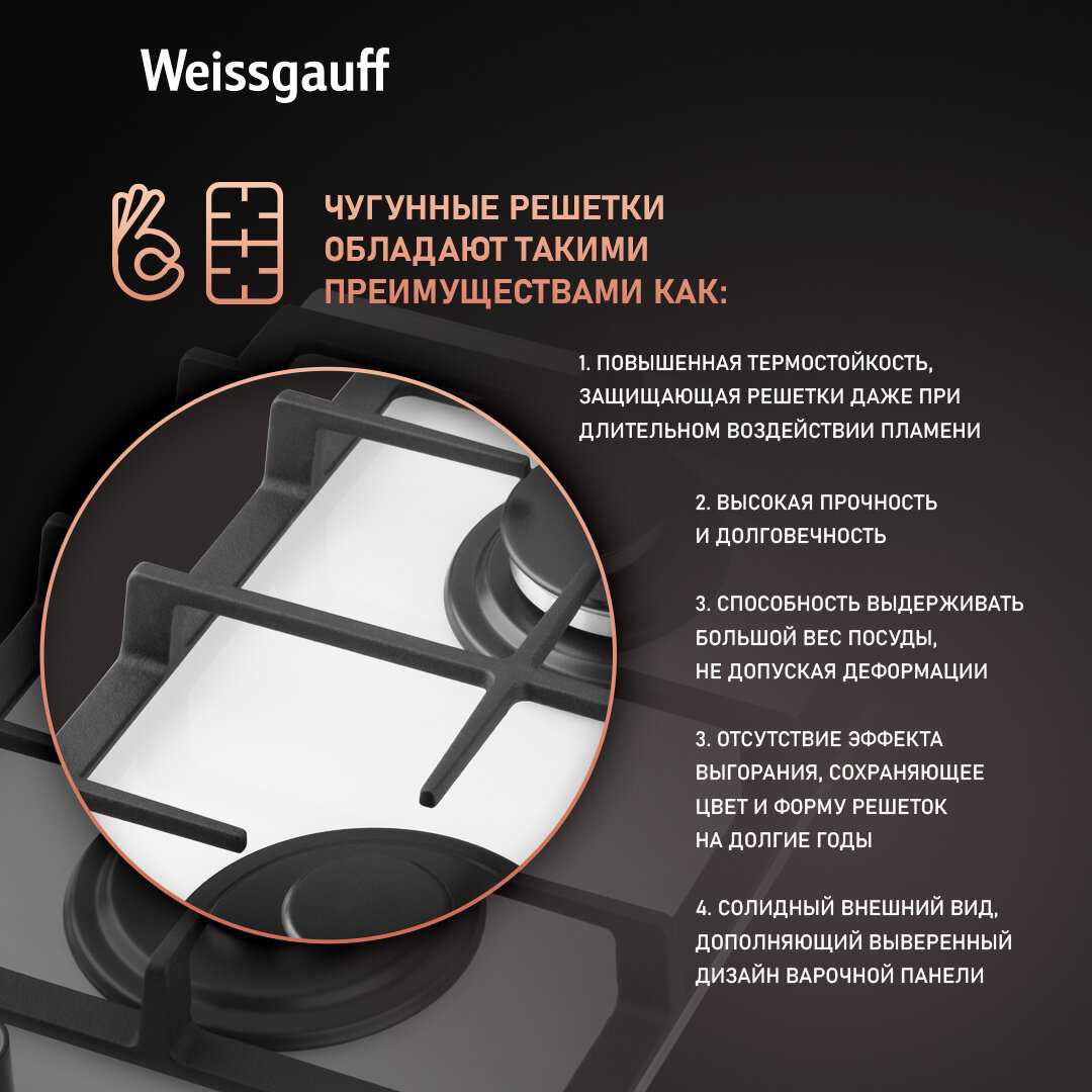 Чугунные решетки плотные, не болтаются и не прогибаются при нагреве, обеспечивая стабильность посуды. Пользователи ценят их вес и надежность, отмечая, что они не царапают стекло благодаря специальным мягким подкладкам. Они легко снимаются для чистки и выдерживают интенсивное использование. В отзывах подчеркивают, что такие решетки добавляют долговечности панели.
