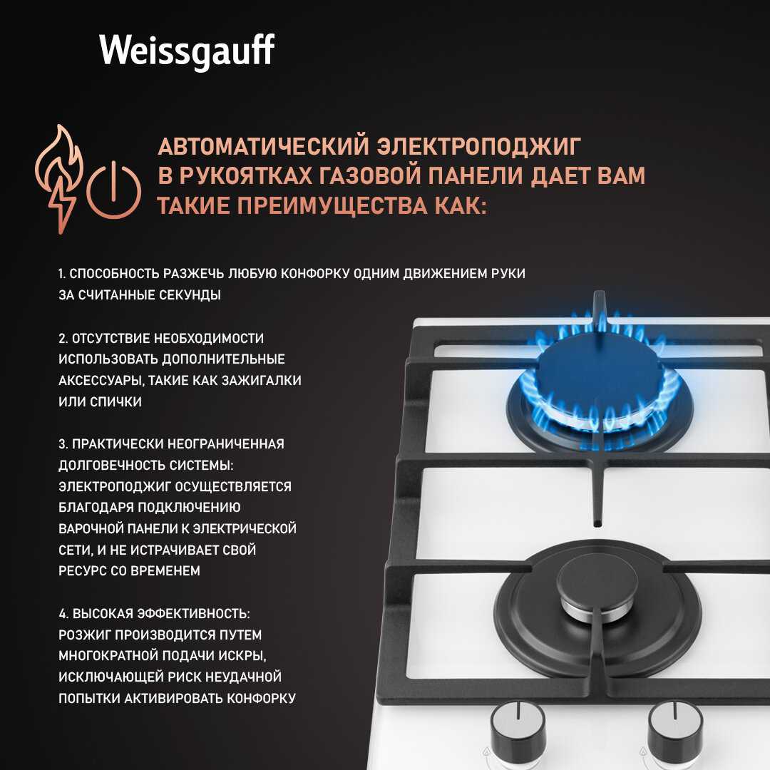 Автоподжиг срабатывает надежно и зажигает конфорки без задержек, что подтверждают多数 пользователей после подключения. Он встроен в каждую конфорку и активируется поворотом ручки, без необходимости использовать спички. В отзывах хвалят его за простоту и отсутствие сбоев даже после года использования. Некоторые отмечают, что пламя сразу получается сильным на большой конфорке, что удобно для быстрого разогрева. -