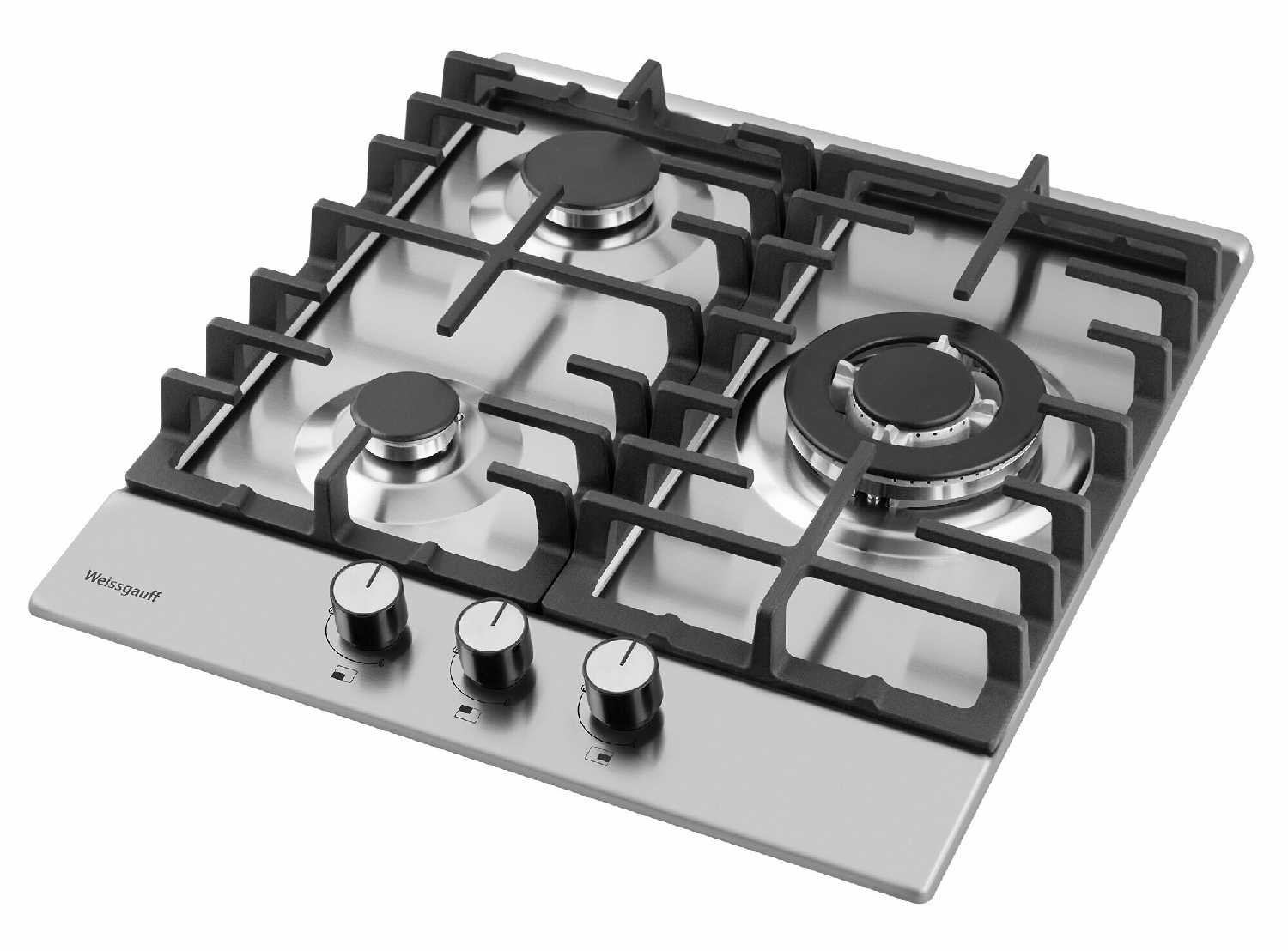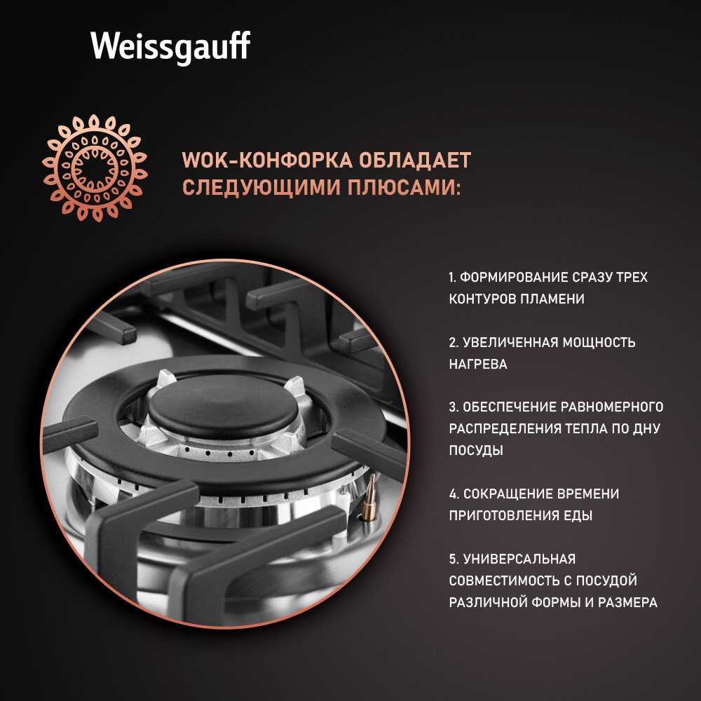 - Три конфорки (включая мощную вок-конфорку) расположены так, что даже крупная посуда не мешает одновременному использованию остальных горелок.