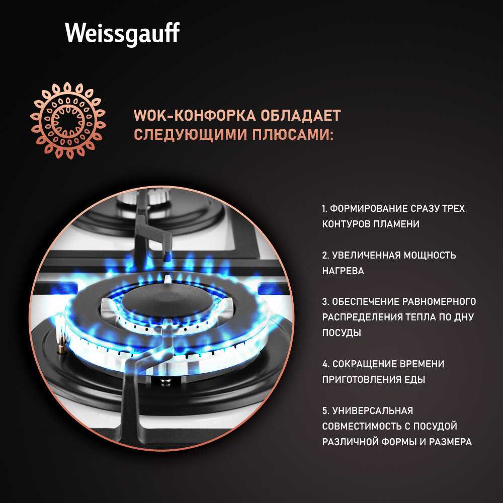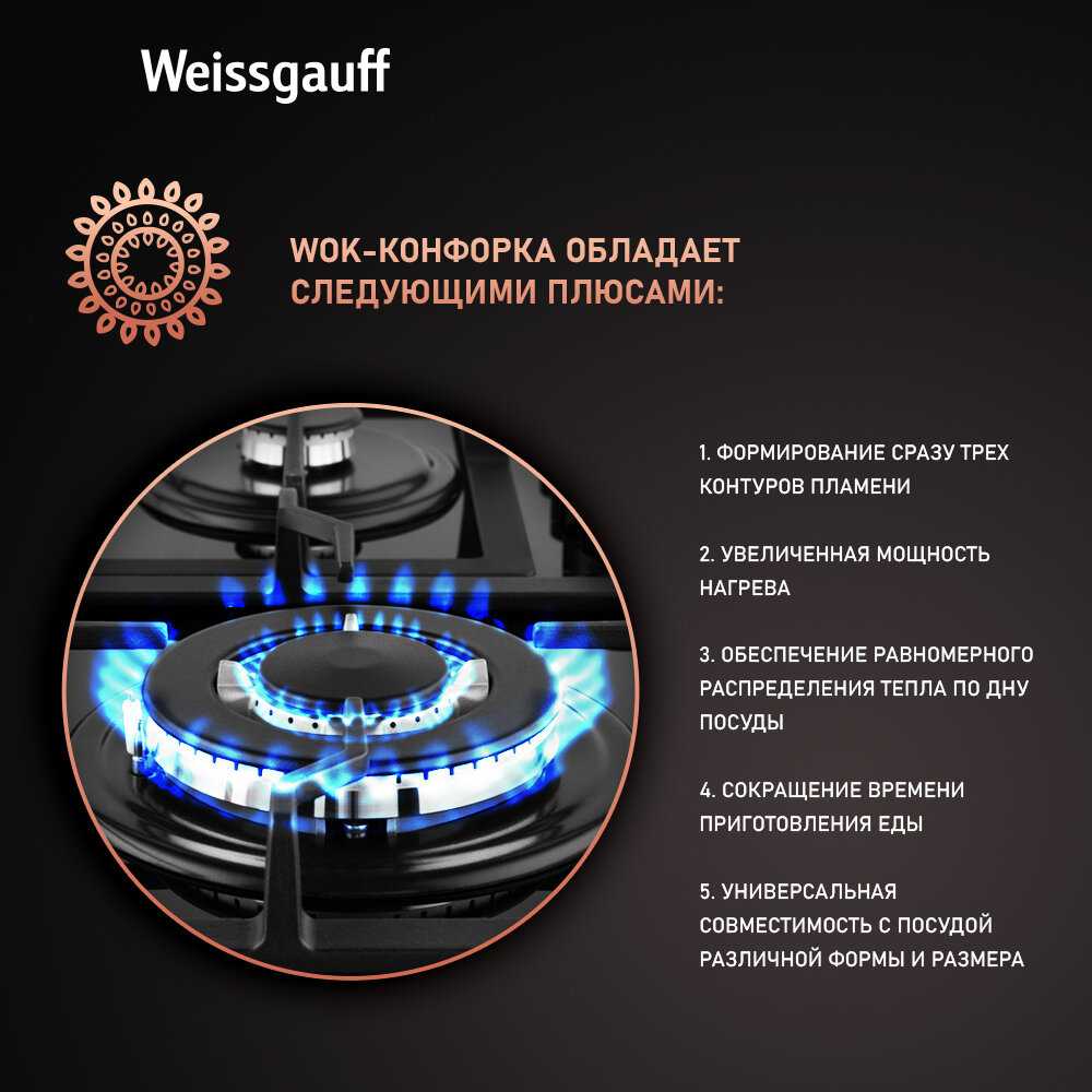 - Тройное пламя на wok-конфорке равномерно прогревает посуду с толстым дном, подходит для вок-сковород.