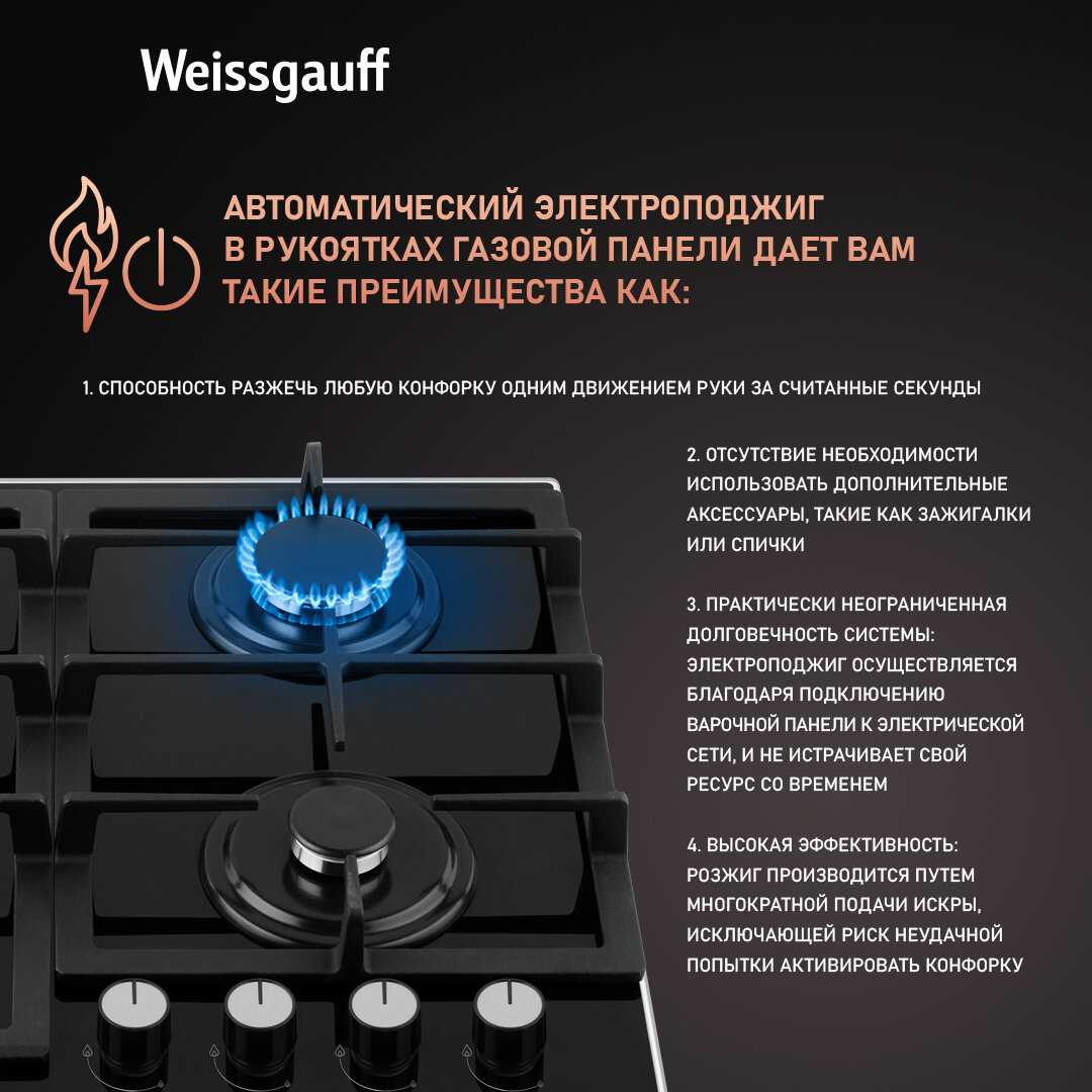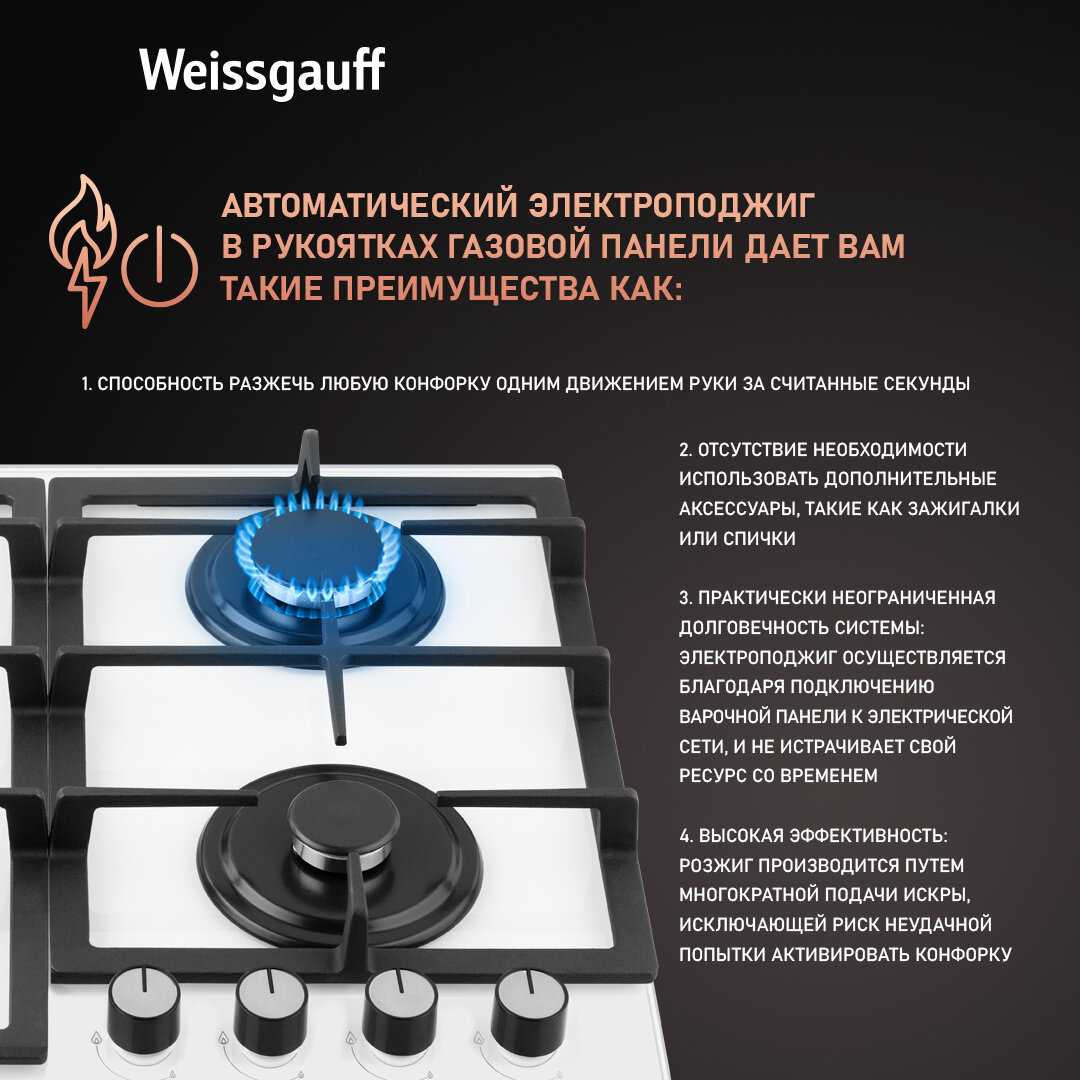 Газ-контроль на каждой конфорке оперативно срабатывает при затухании пламени, предотвращая утечку газа – это особо отмечено пользователями с детьми. Автоматический электроподжиг работает стабильно при включении, хотя один отзыв указывал на треснутый изолятор пьезоэлемента на WOK-конфорке у конкретного экземпляра. В целом система оценивается как надежная. -