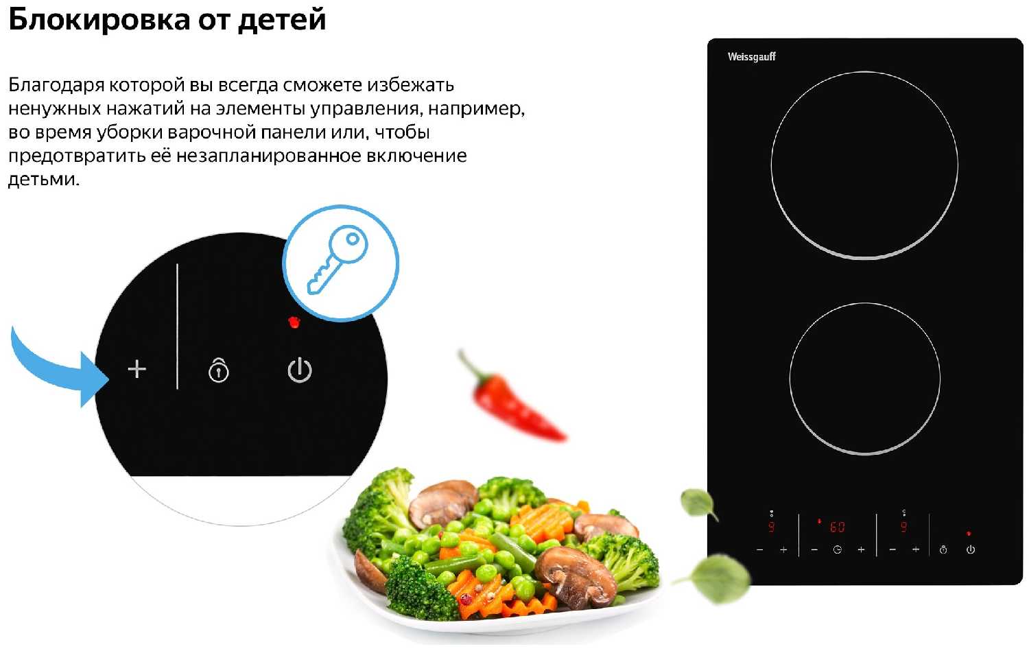 - Отсутствие звукового сигнала при деактивации блокировки повышает риск незаметного включения конфорок детьми.