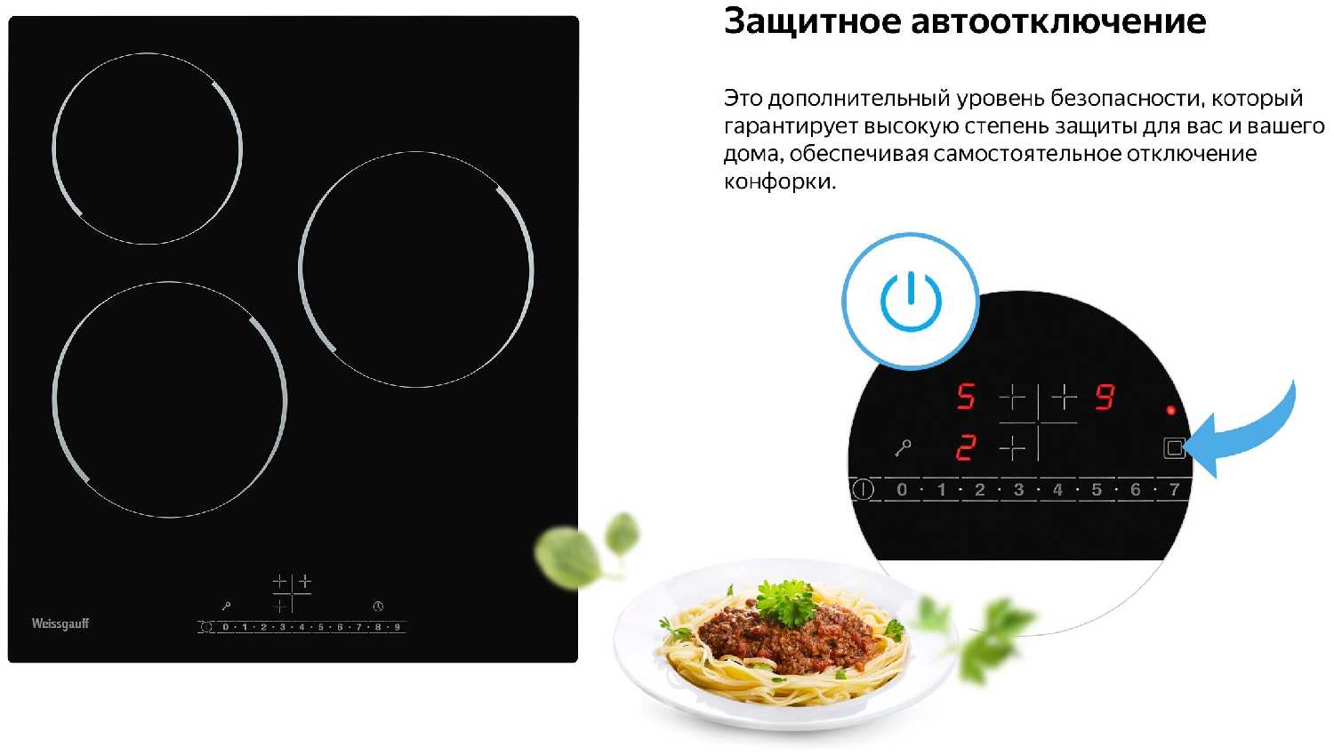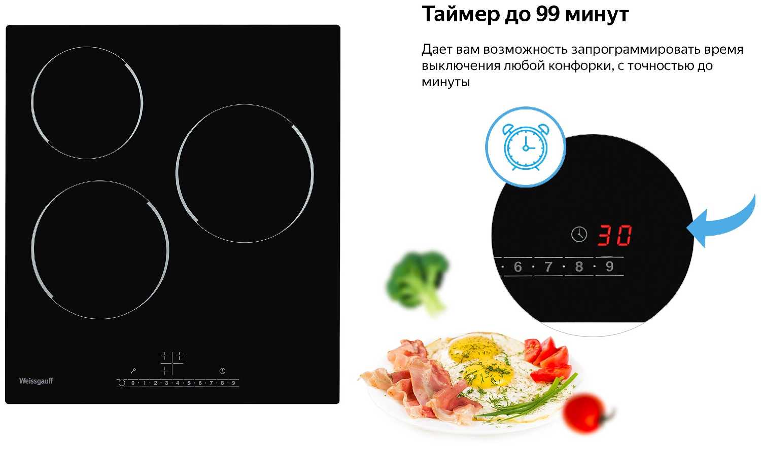 - Автоматическое отключение конфорки после срабатывания таймера.