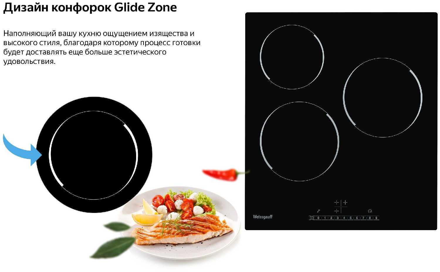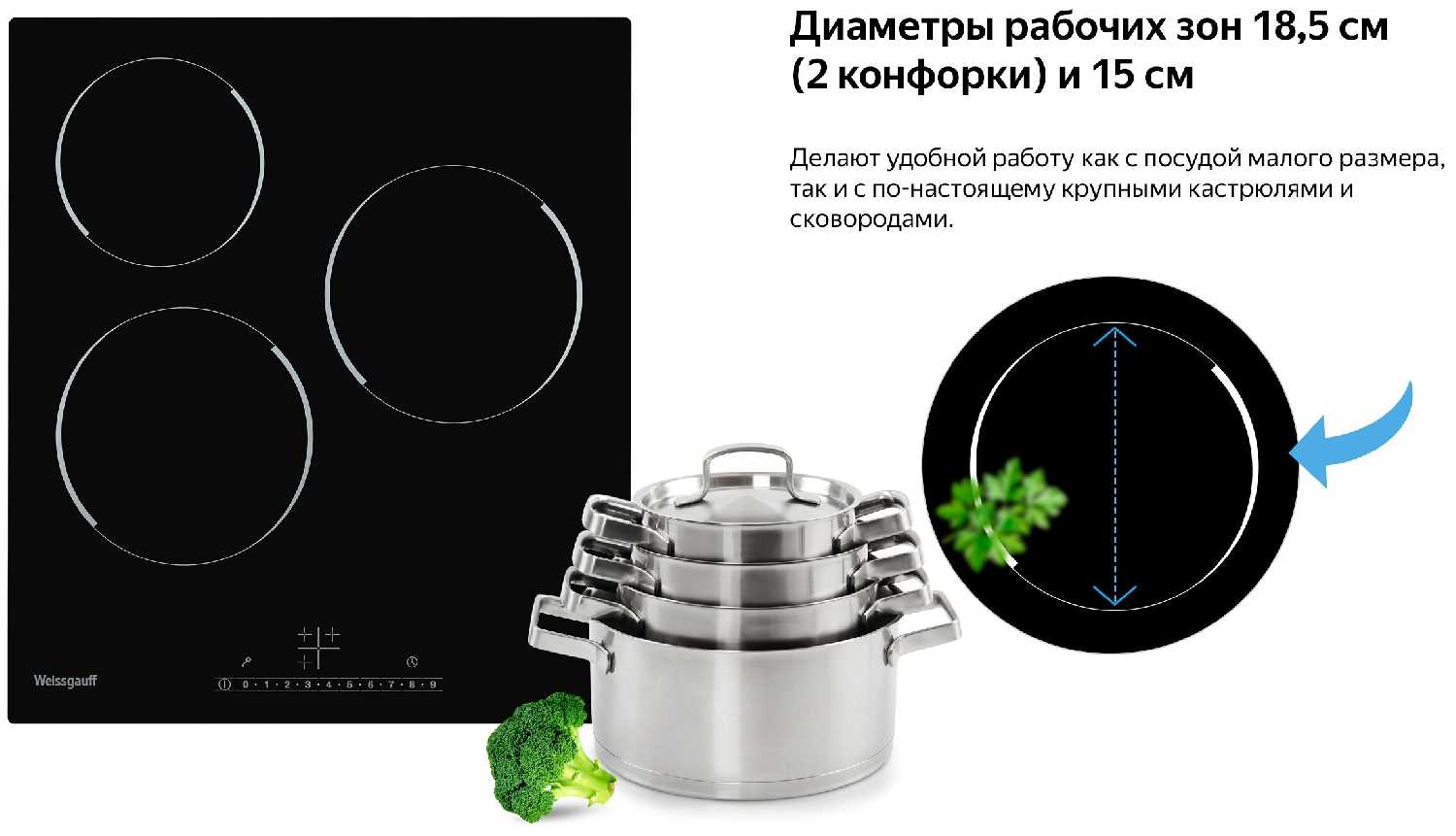 - Равномерное распределение тепла: диаметр зон нагрева (14.5 см, 18 см) адаптирован под стандартную посуду.
