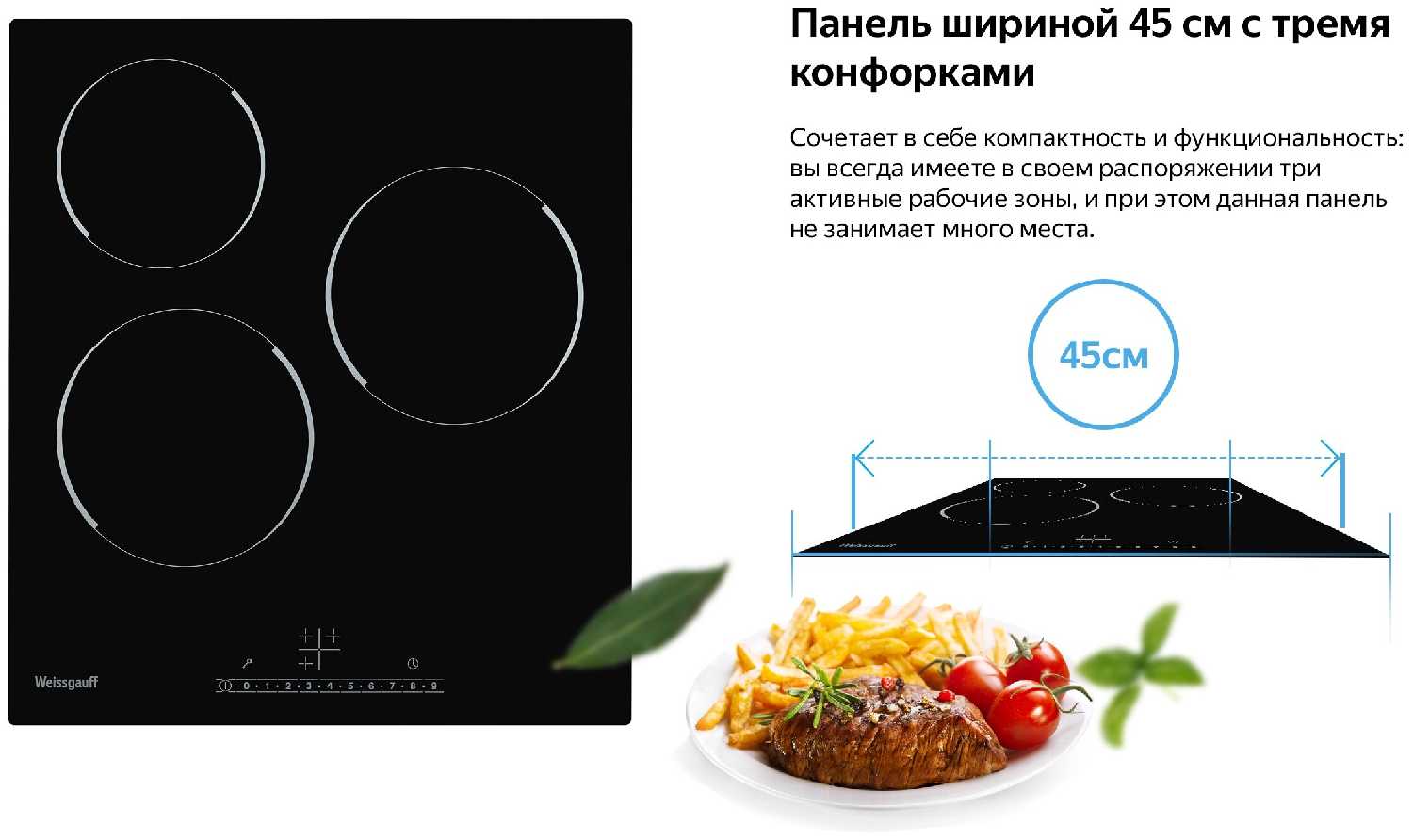 - Компактные габариты (45 см) и продуманное расположение конфорок: