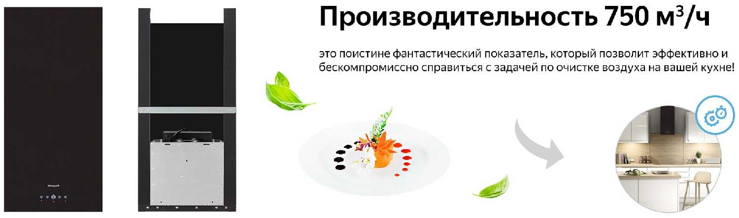 - Отлично справляется с дымом, гарью и запахами даже на кухне 20 м² или большой площади.