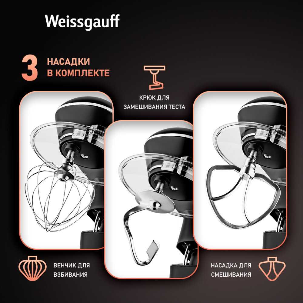 - Металлические насадки в комплекте демонстрируют долговечность при работе с густым тестом.