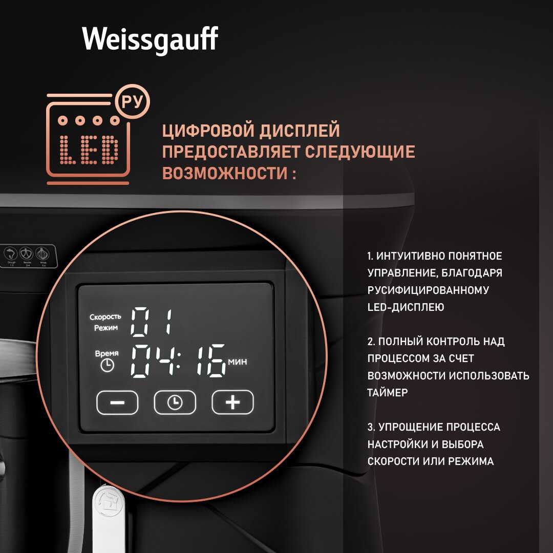 - Наличие таймера позволяет автоматизировать процесс замешивания и освободить руки.