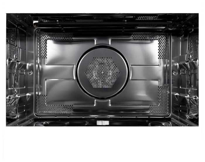 Дизайн достаточно современный.Утапливаемые поворотные переключатели,с ними оч быстро можно установить мощность,время и пр.,чем это переключать на сенсоре.Есть часы,достаточно яркие.Поначалу немного пугал вентилятор,который продолжает работать некоторое время,даже в режиме СВЧ.