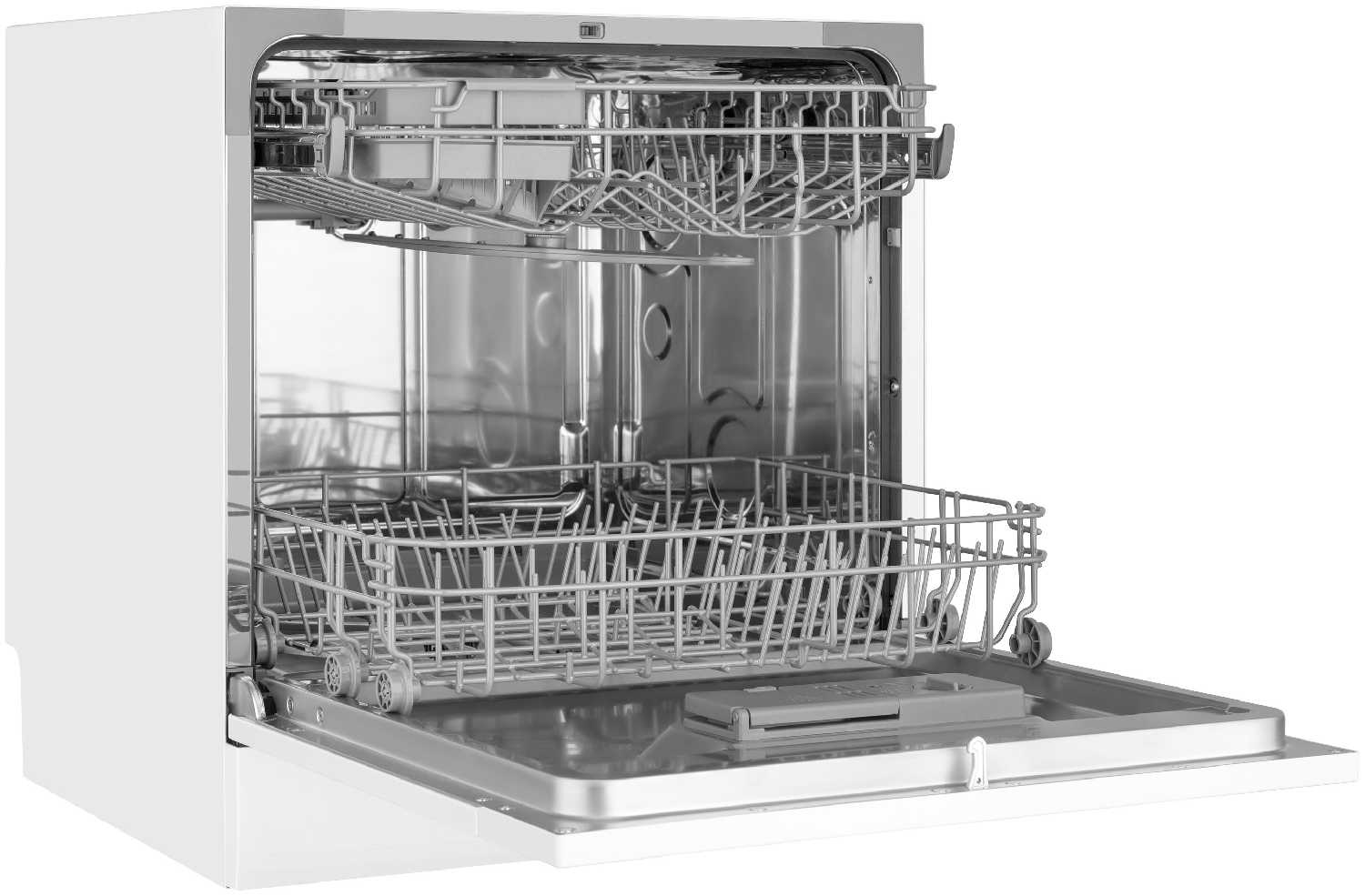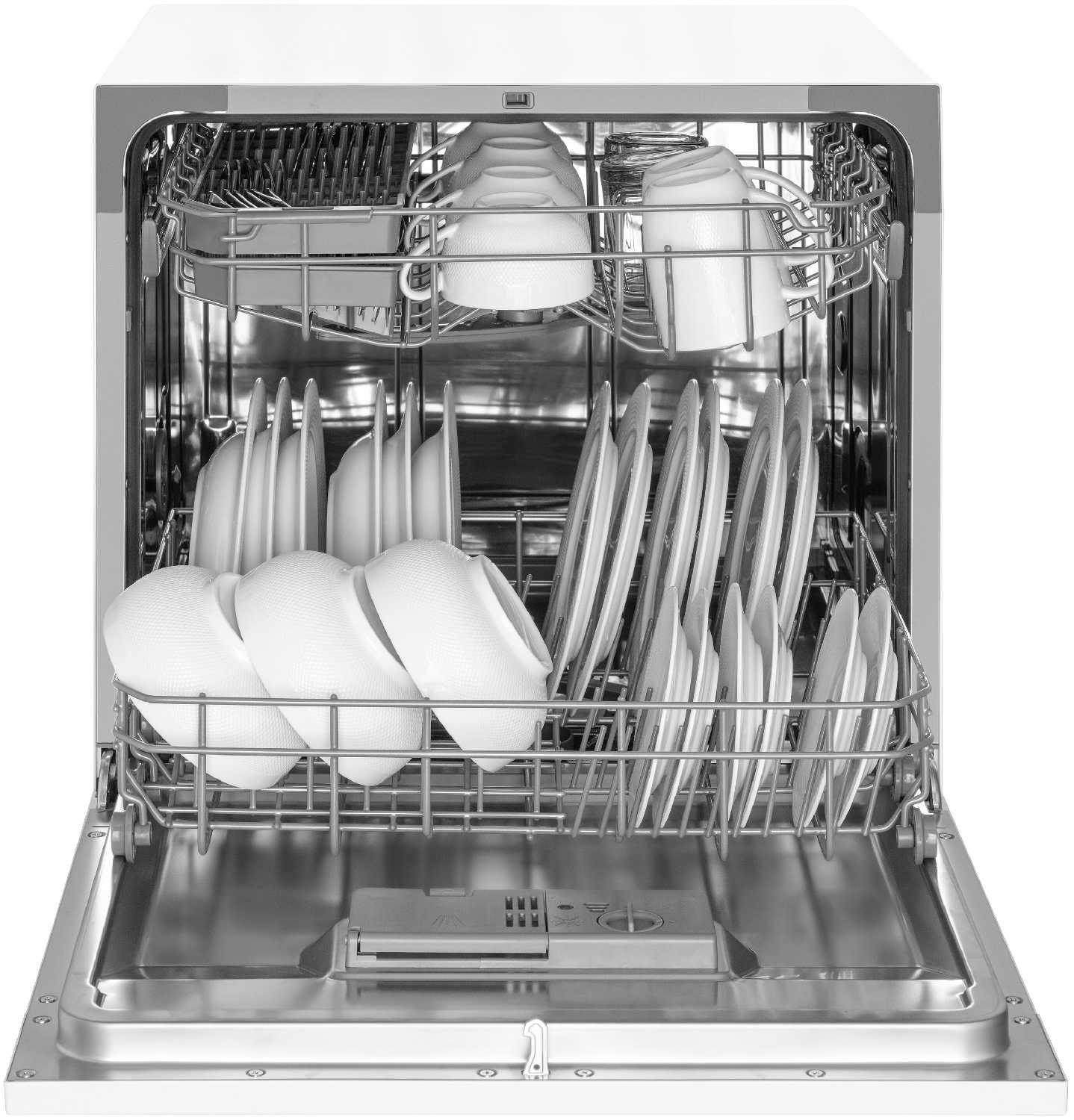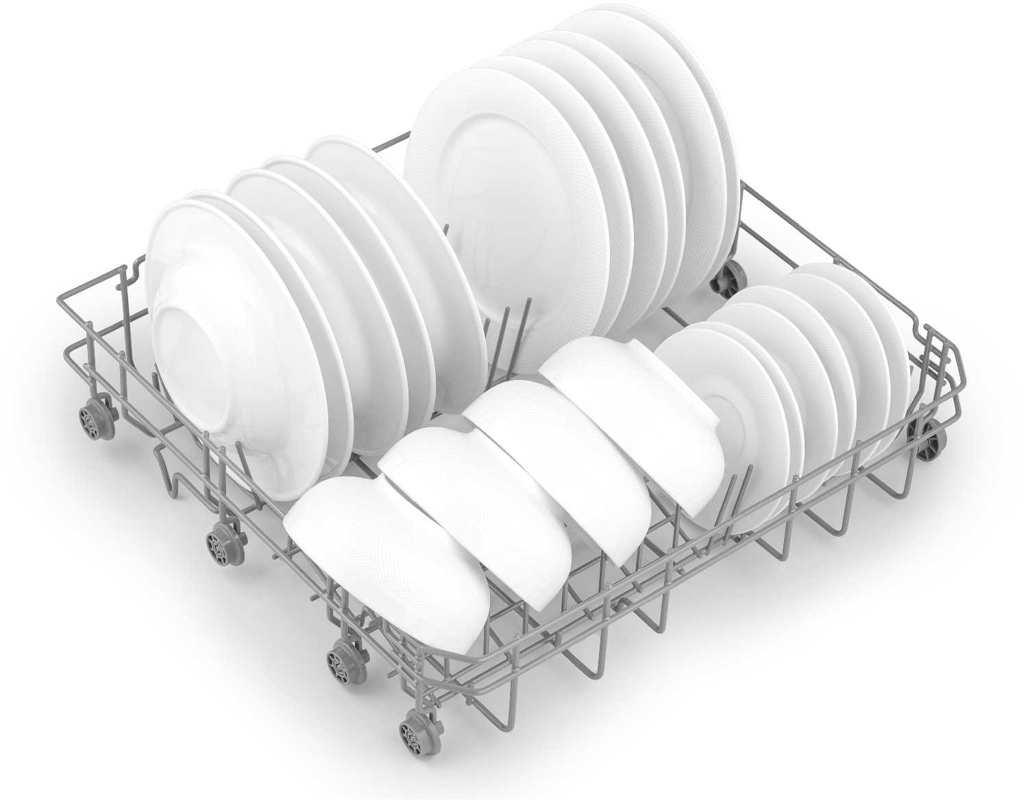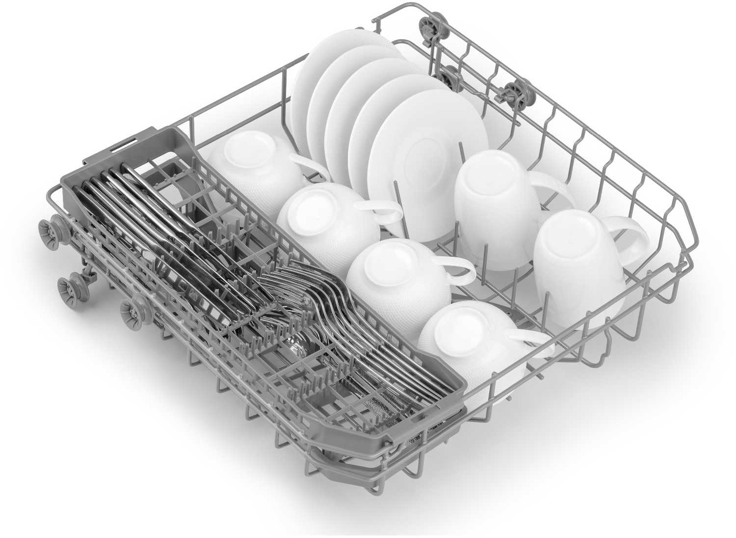- Два вращающихся разбрызгивателя (верхний и нижний) обеспечивают полное покрытие посуды водой даже в компактном корпусе.