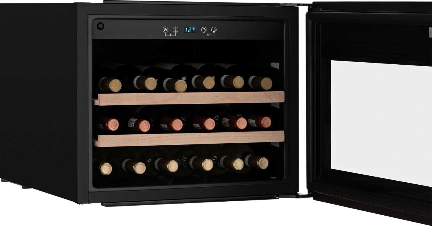 - + Удобный холодильник, возможность переставлять полки под разные бутылки, приятная led подсветка. Сенсорная кнопка и мягкий пуш открывающейся дверци. Абсолютно бесшумный. В нижней части есть регулирующиеся по высоте ножки, можно выставить по уровню.