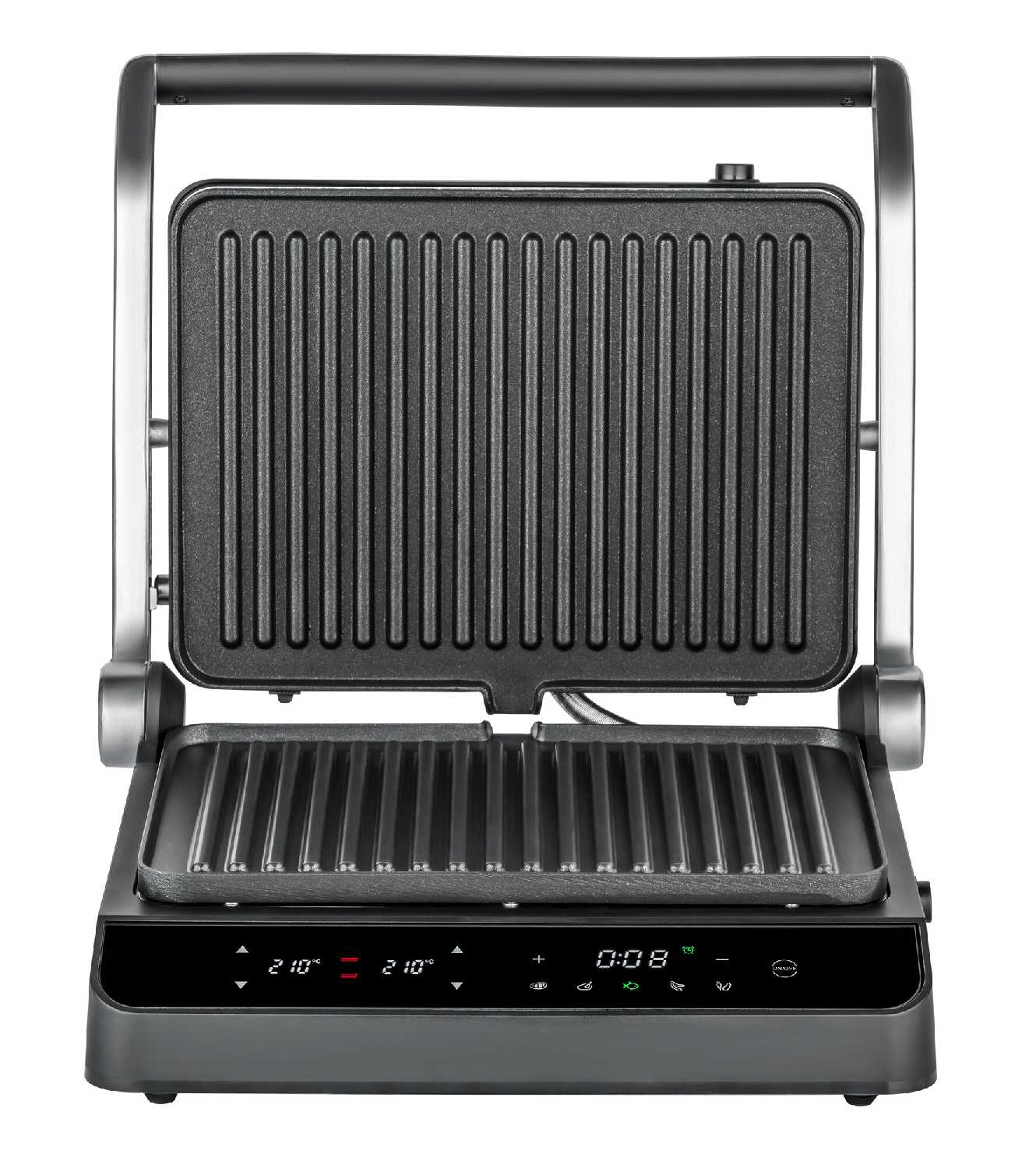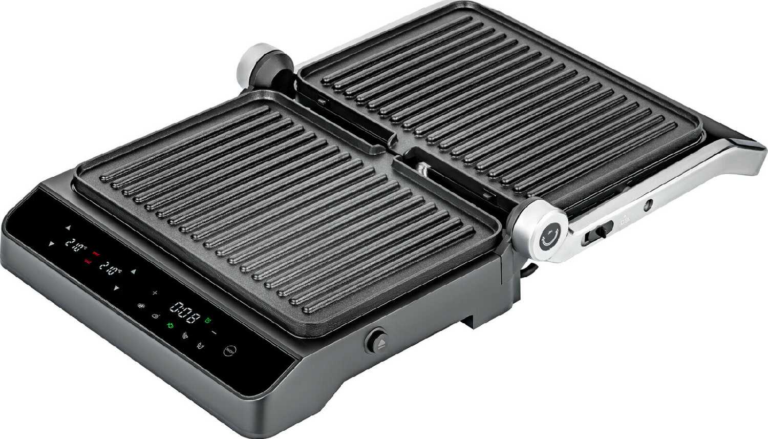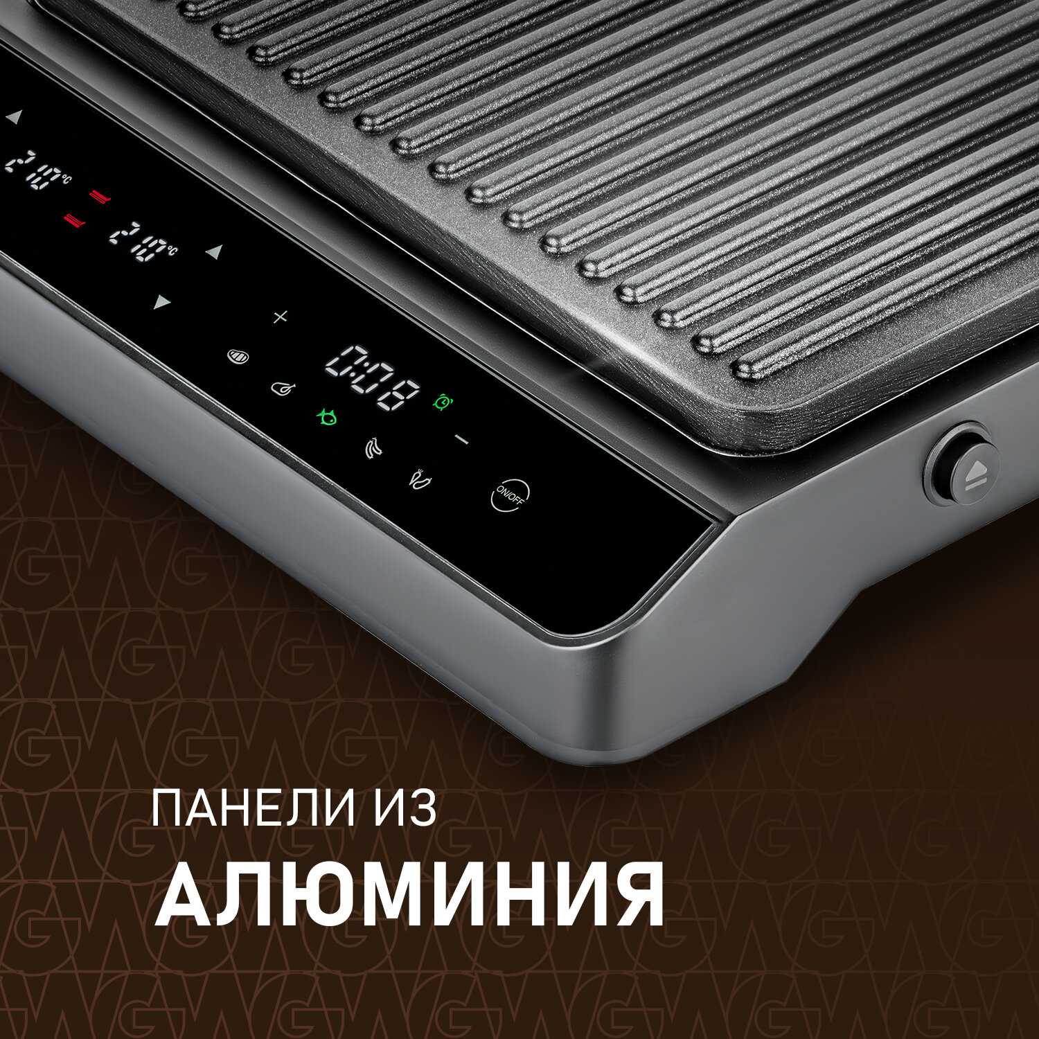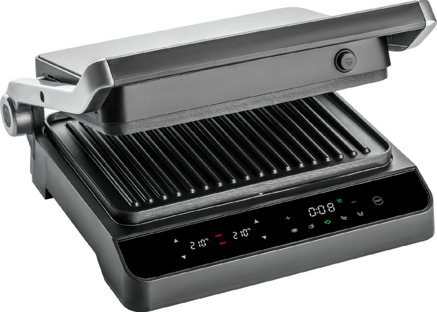 - + Красивый дизайн, разворот на 180° для барбекю, дисплей с индикацией; подача звукового сигнала при нагреве и в конце приготовления; таймер, независимое управление панелями и временем; съёмные панели, сборник для сока и жира.