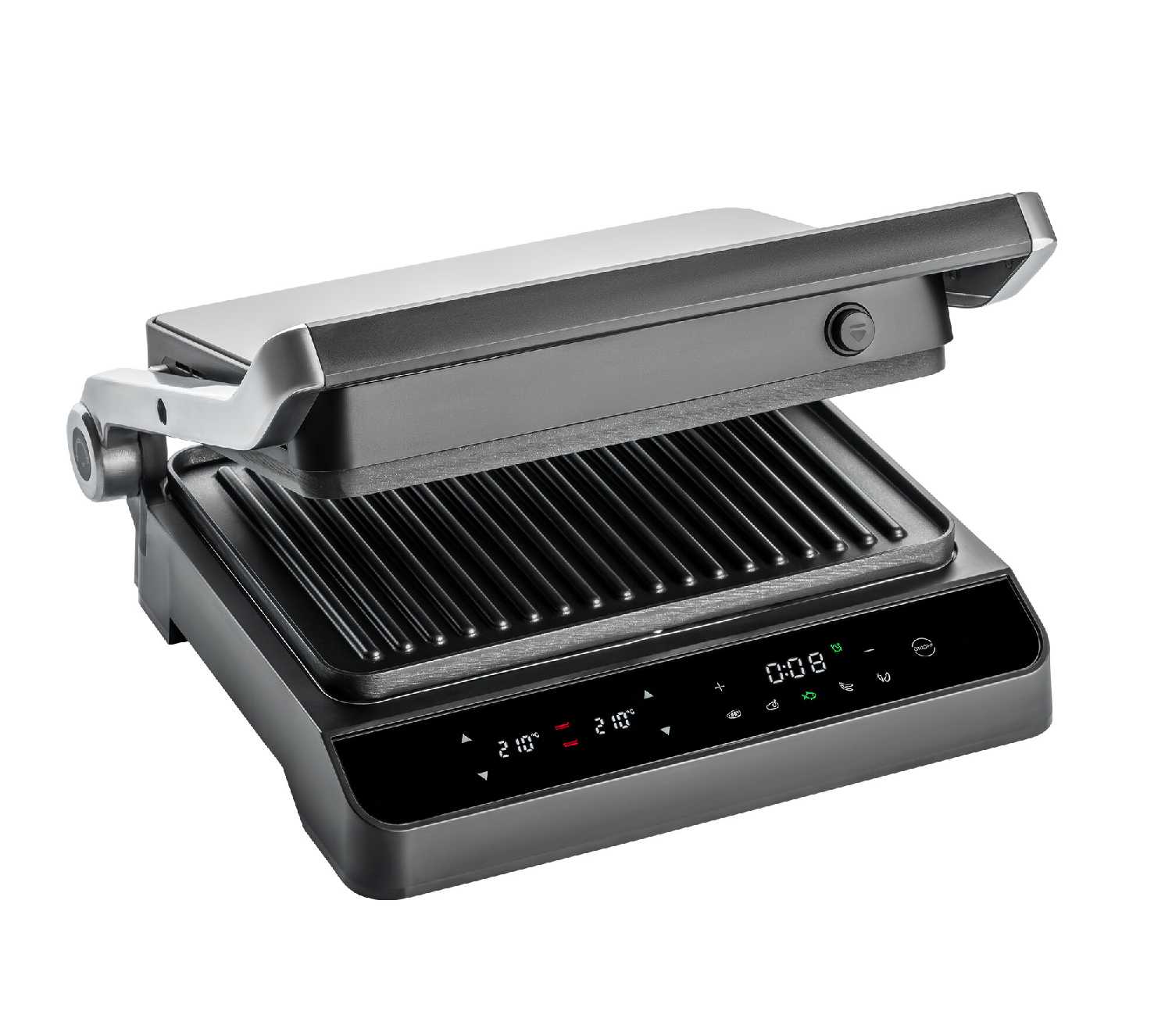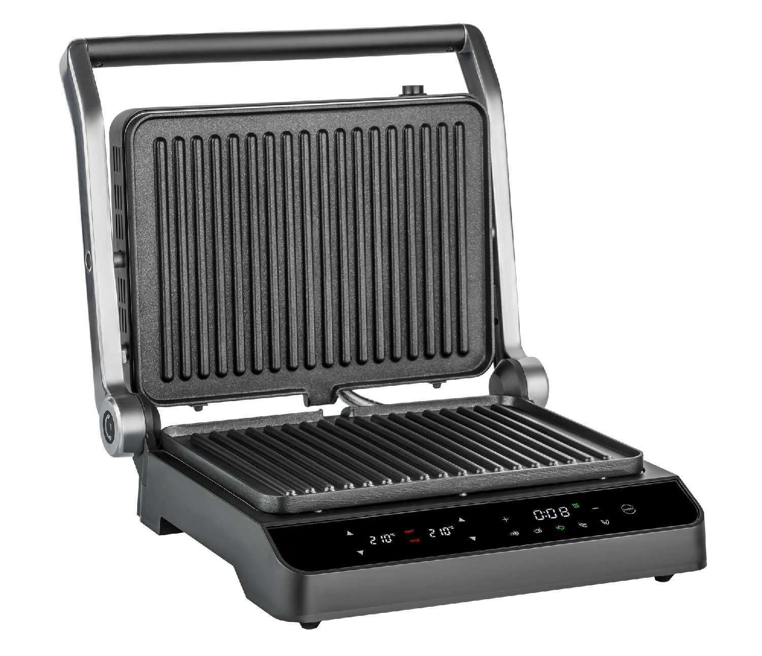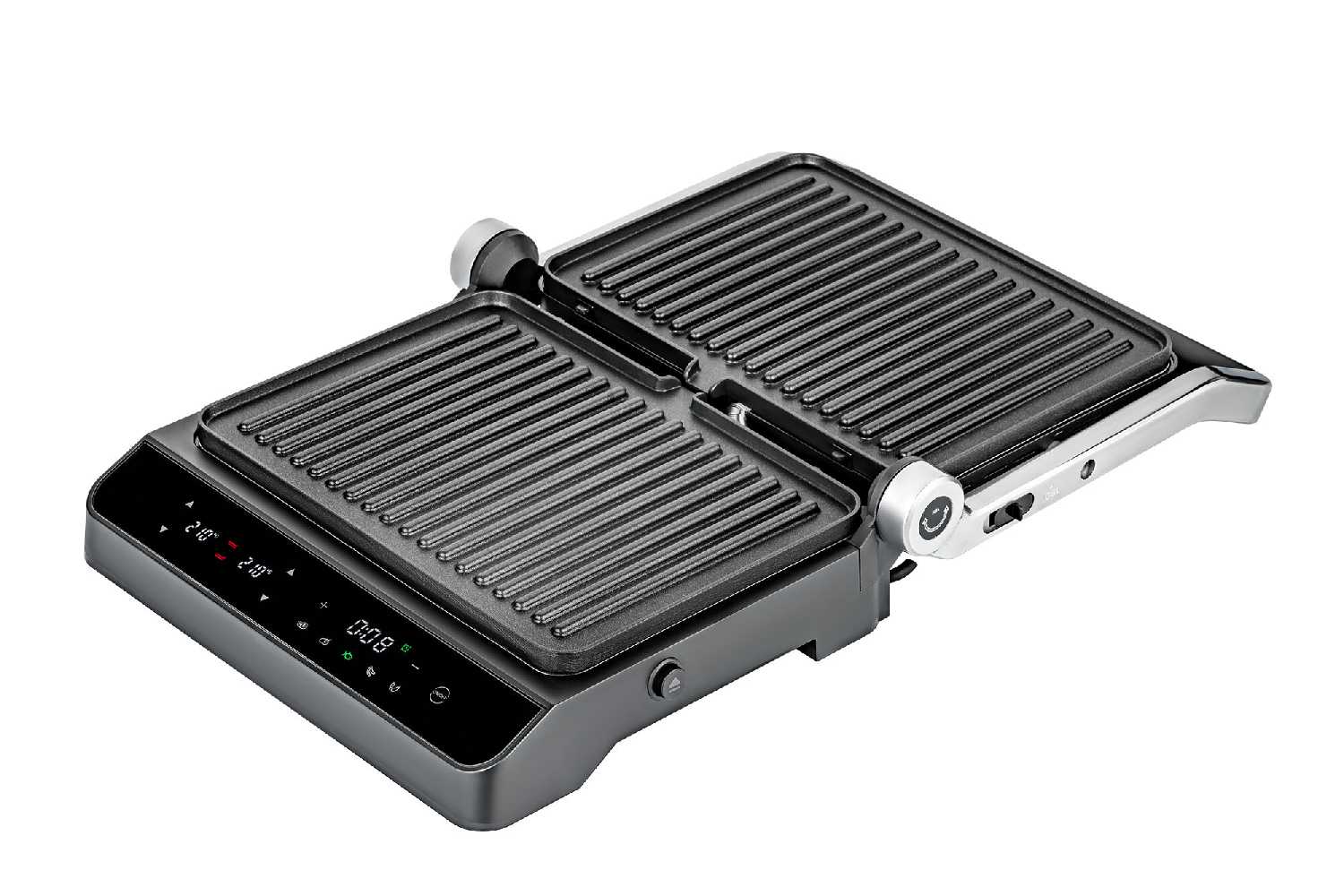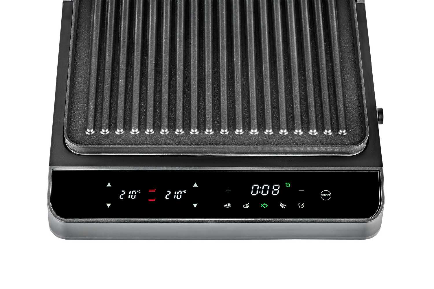 - + Красивый дизайн, разворот на 180° для барбекю, дисплей с индикацией; подача звукового сигнала при нагреве и в конце приготовления; таймер, независимое управление панелями и временем; съёмные панели, сборник для сока и жира.