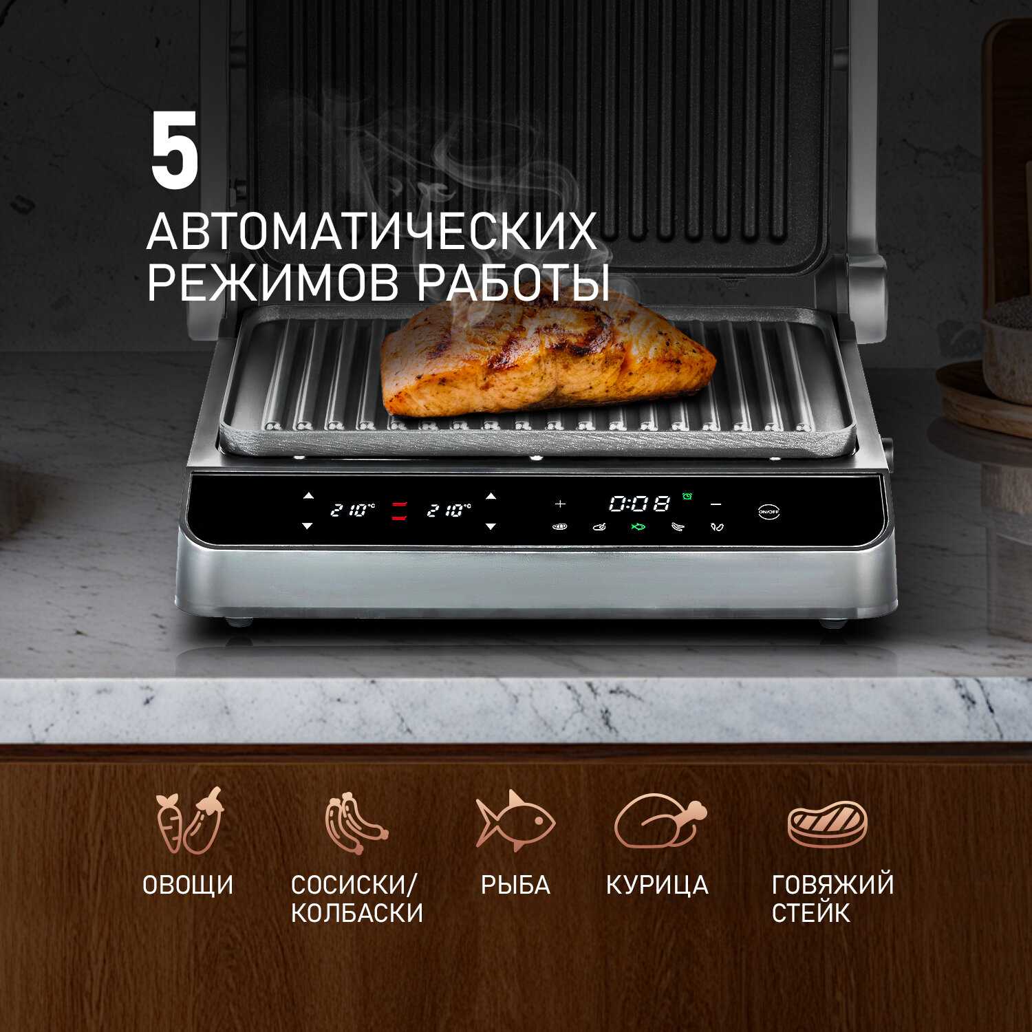 - Раздельная регулировка температуры верхней и нижней панелей обеспечивает гибкость в приготовлении разных блюд.