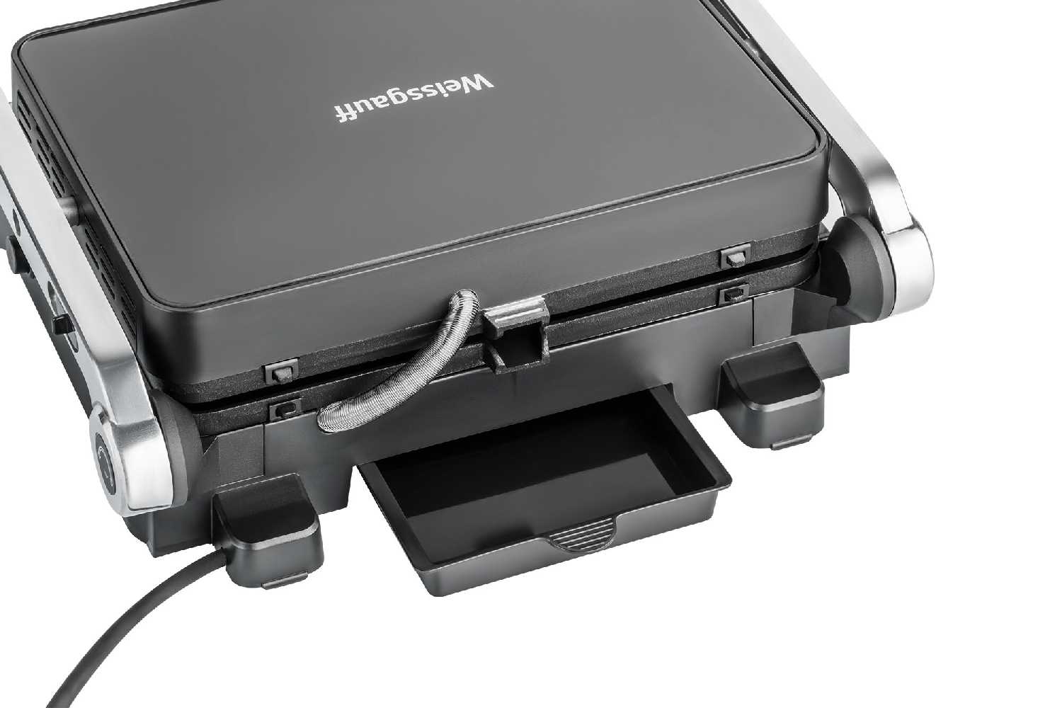 Аппарат отличается компактными размерами и не занимает много места на кухне. Он обладает стильным дизайном, который хорошо вписывается в современный интерьер. Конструкция позволяет раскрывать его на 180 градусов, что удобно для режима барбекю и обслуживания. -