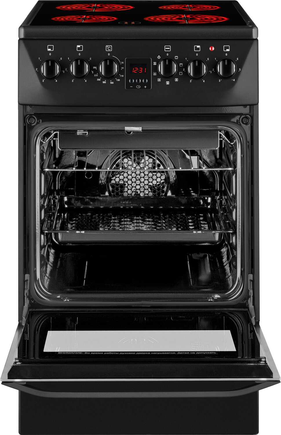 - Стекло духового шкафа и боковые панели нагреваются до температур, опасных для прикосновения.