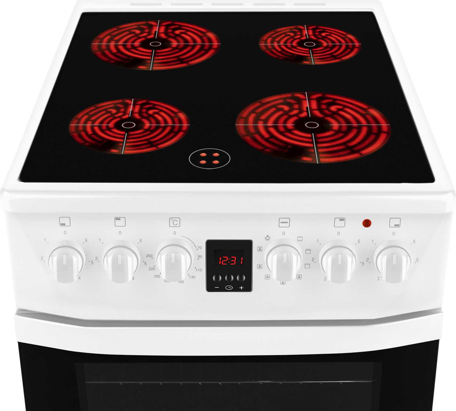 - Тугие, чёткие переключатели с индикаторами тепла на конфорках, электронный таймер и часы упрощают эксплуатацию.