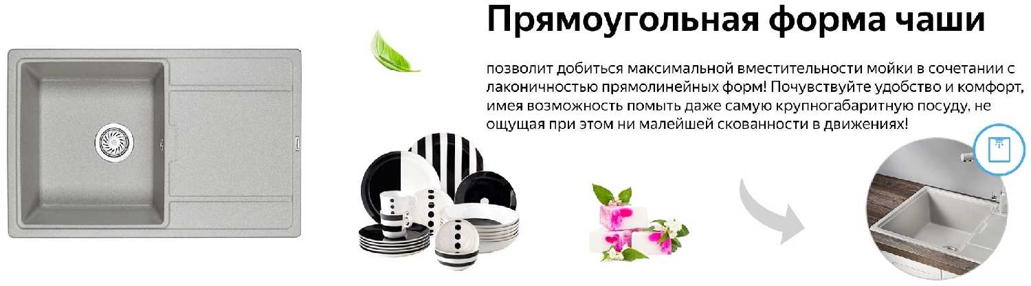 - Прямоугольная форма и увеличенная площадь дна позволяют одновременно замачивать овощи и мыть посуду без дискомфорта.