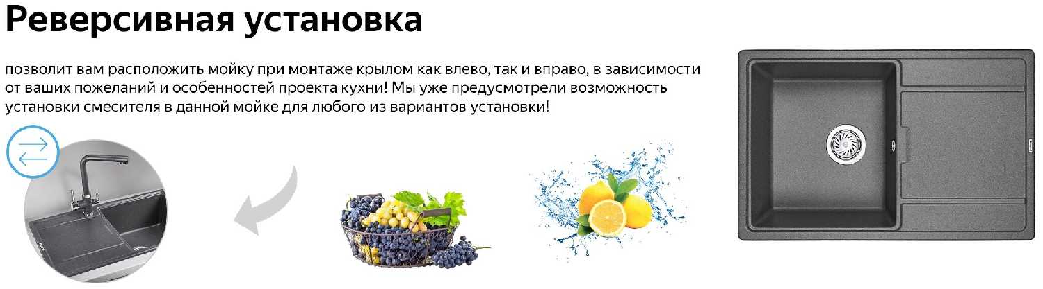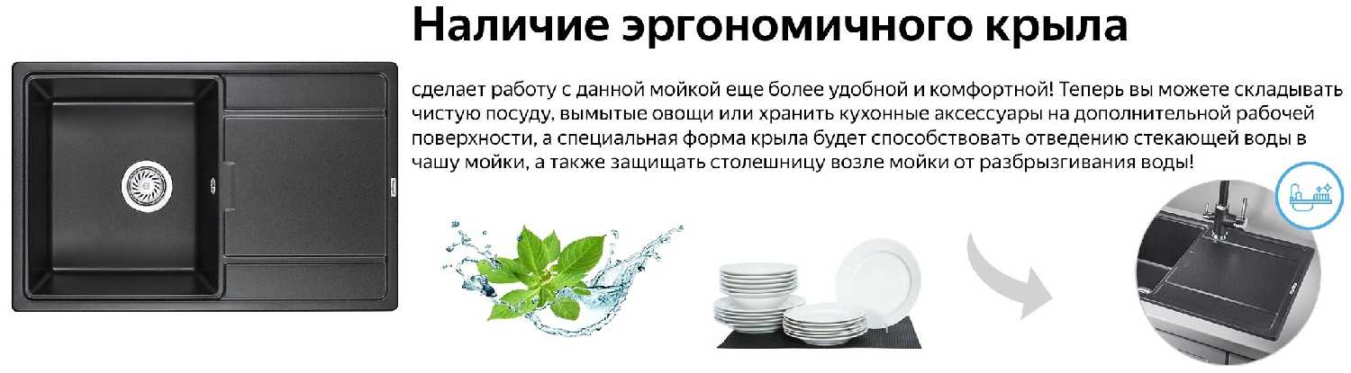 - Глубина чаши (точные параметры не указаны, но в отзывах подчеркивается возможность мытья крупной посуды — казанов, кастрюль) предотвращает разбрызгивание воды.