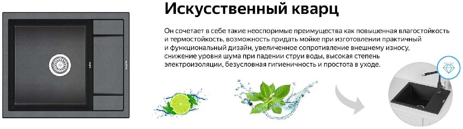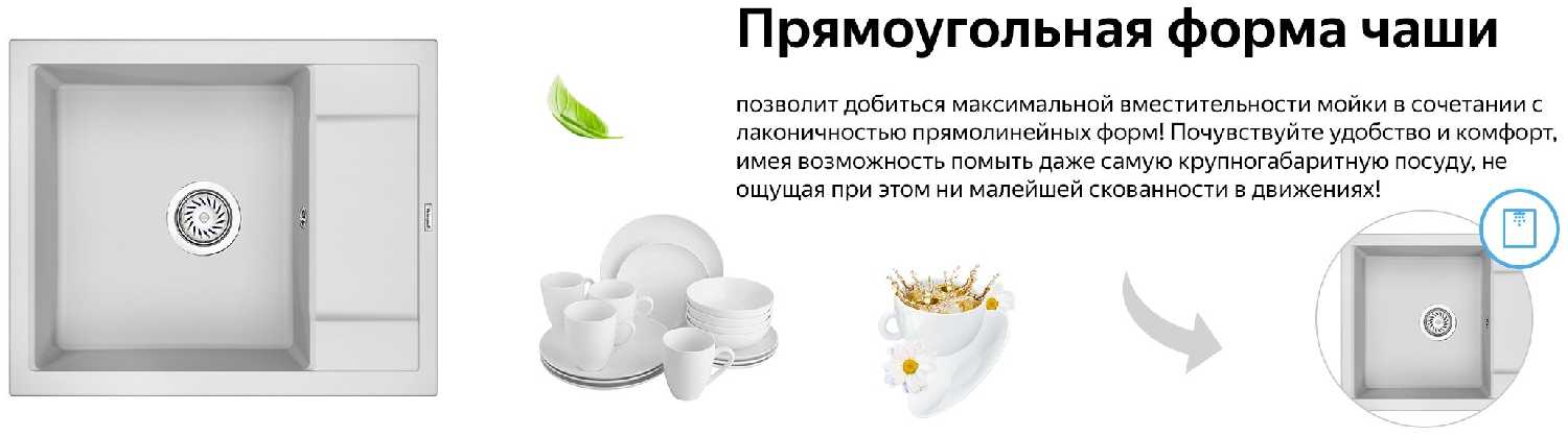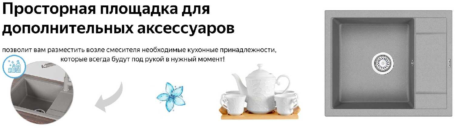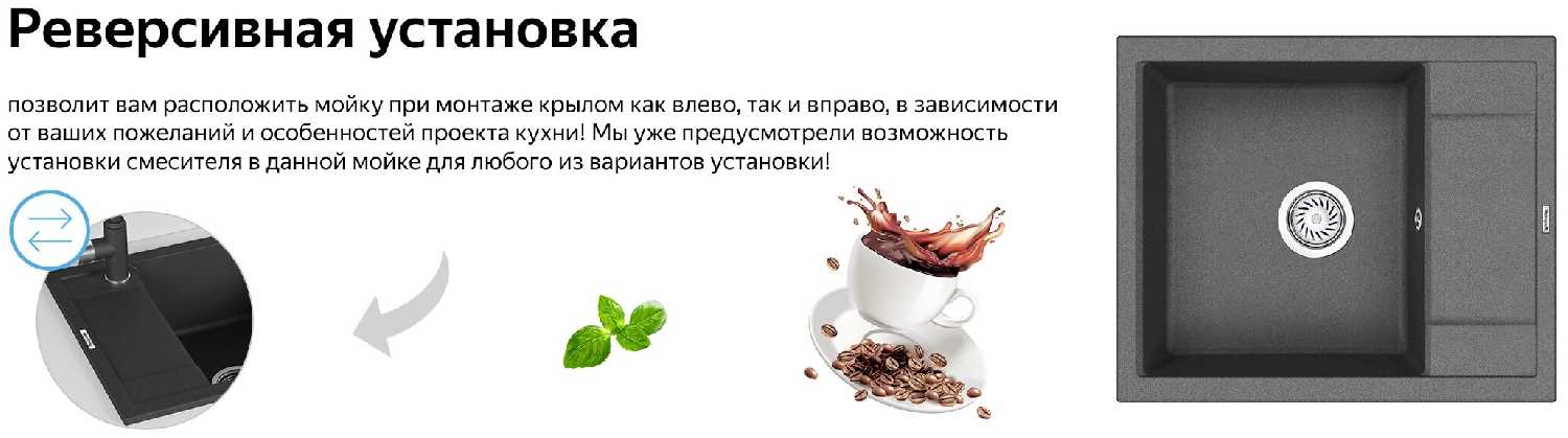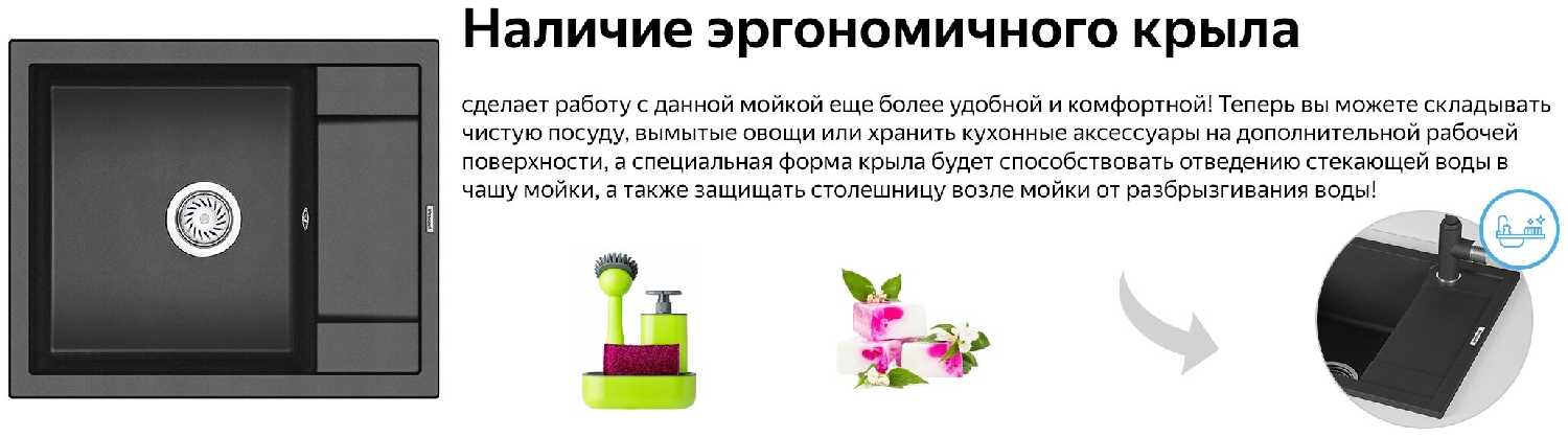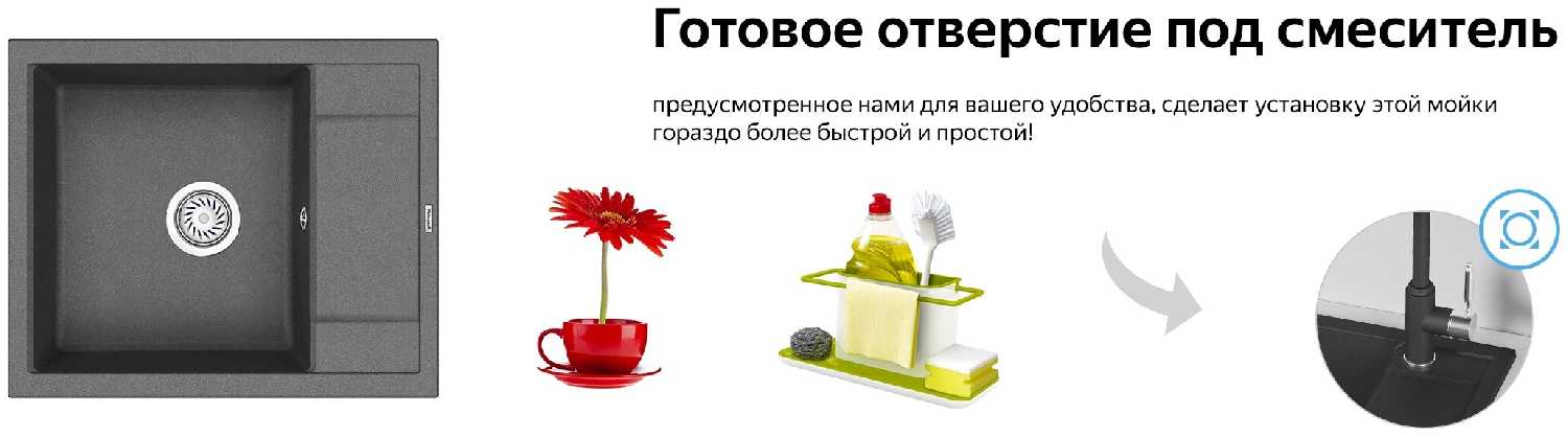 - + Красивый глубокий цвет, оптимальный размер для небольшой кухни, есть место для монтажа кнопки измельчителя и дозатора