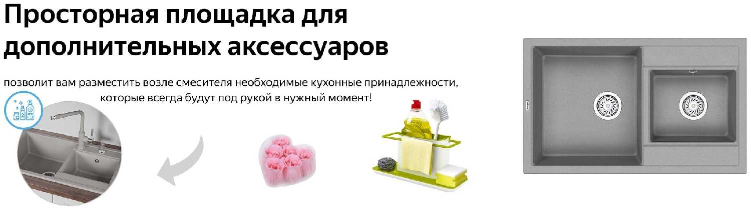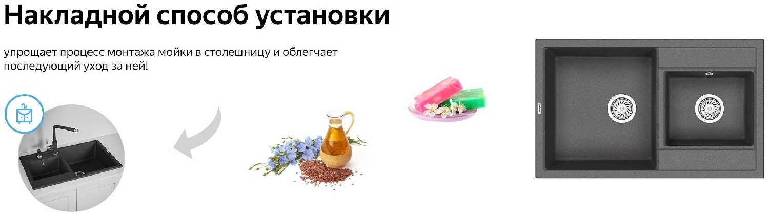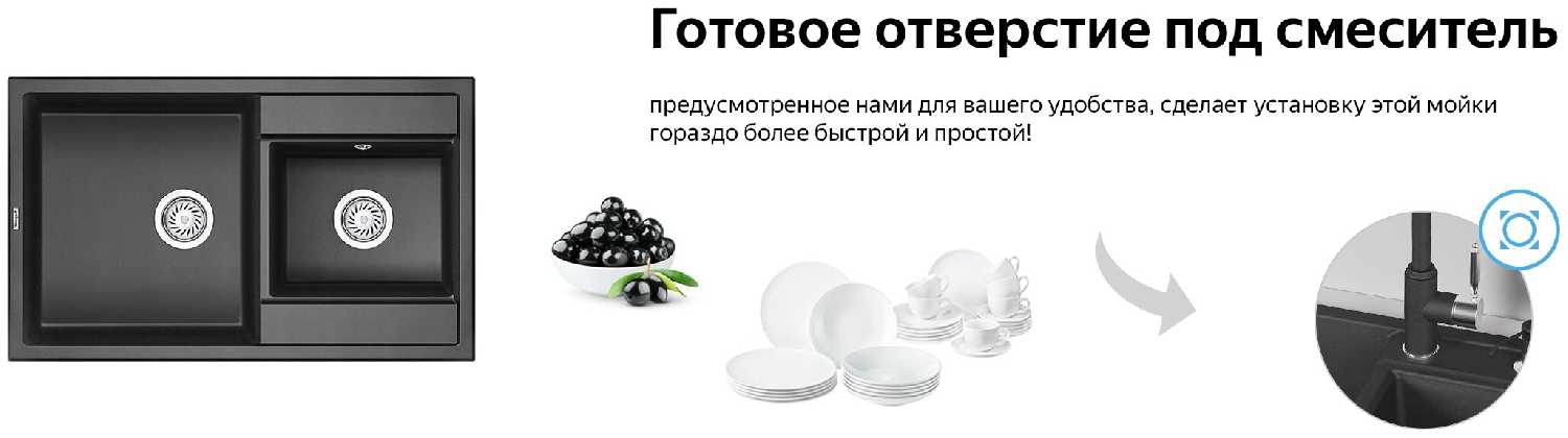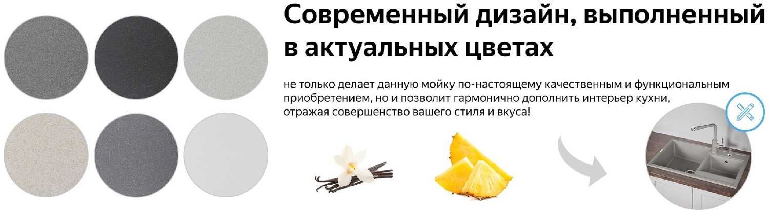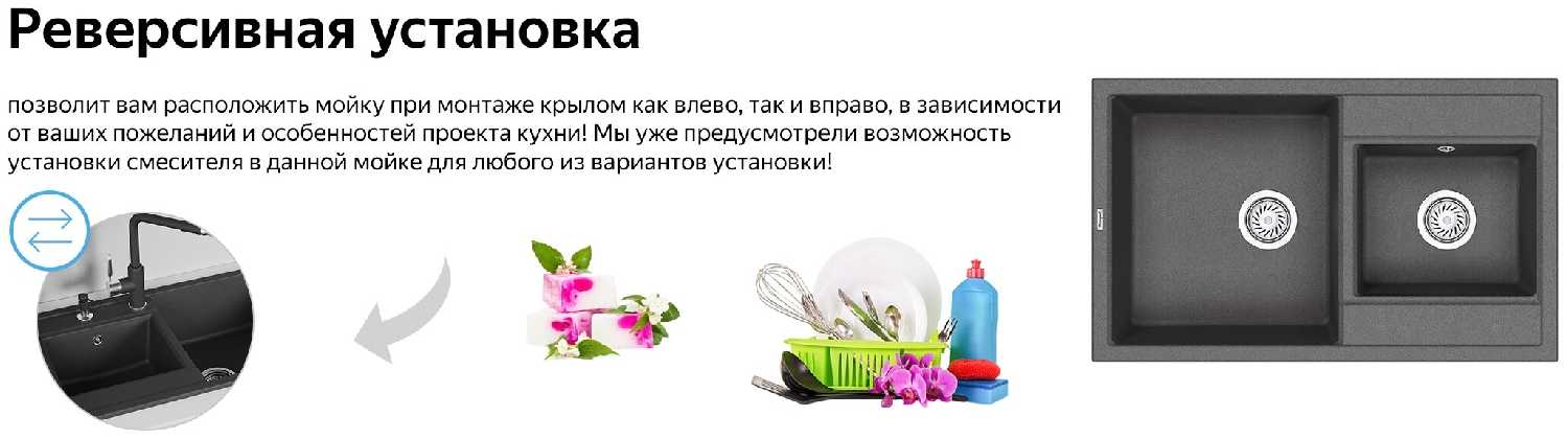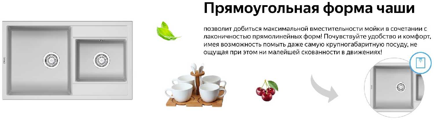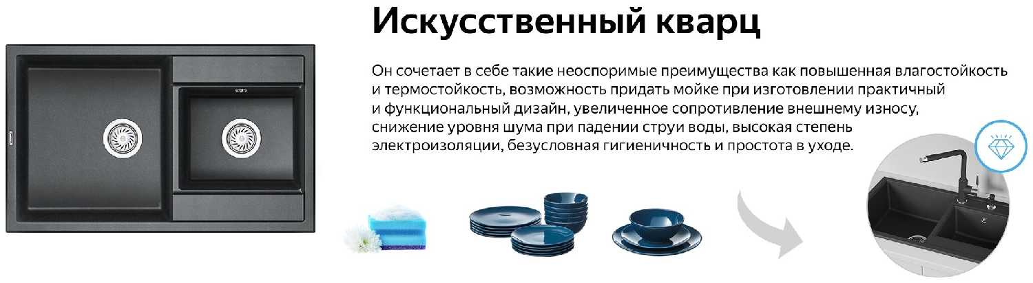 - + Мойка красивая, цвет богатый, покрытие (или это сам материал такой) качественное. Грязь и запах не впитывает. Смотрится просто шикарно