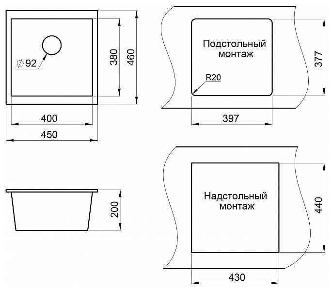 - Два варианта монтажа — накладной и подстольный — адаптируют мойку под разные типы столешниц.