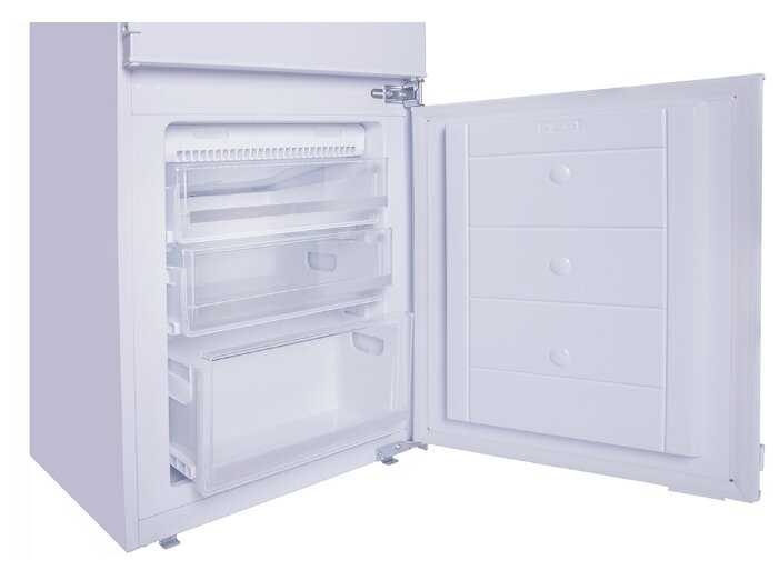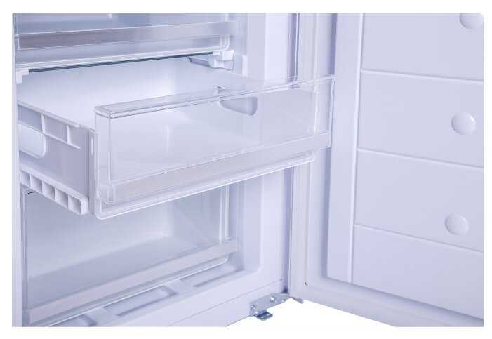 Серьёзный минус — отсутствие двузонного No Frost. Капельная система разморозки холодильного отделения требует ручного ухода 2–3 раза в год, а иней на задней стенке может испортить продукты при неплотном закрытии дверцы. Однако для встраиваемой техники это стандартная практика.