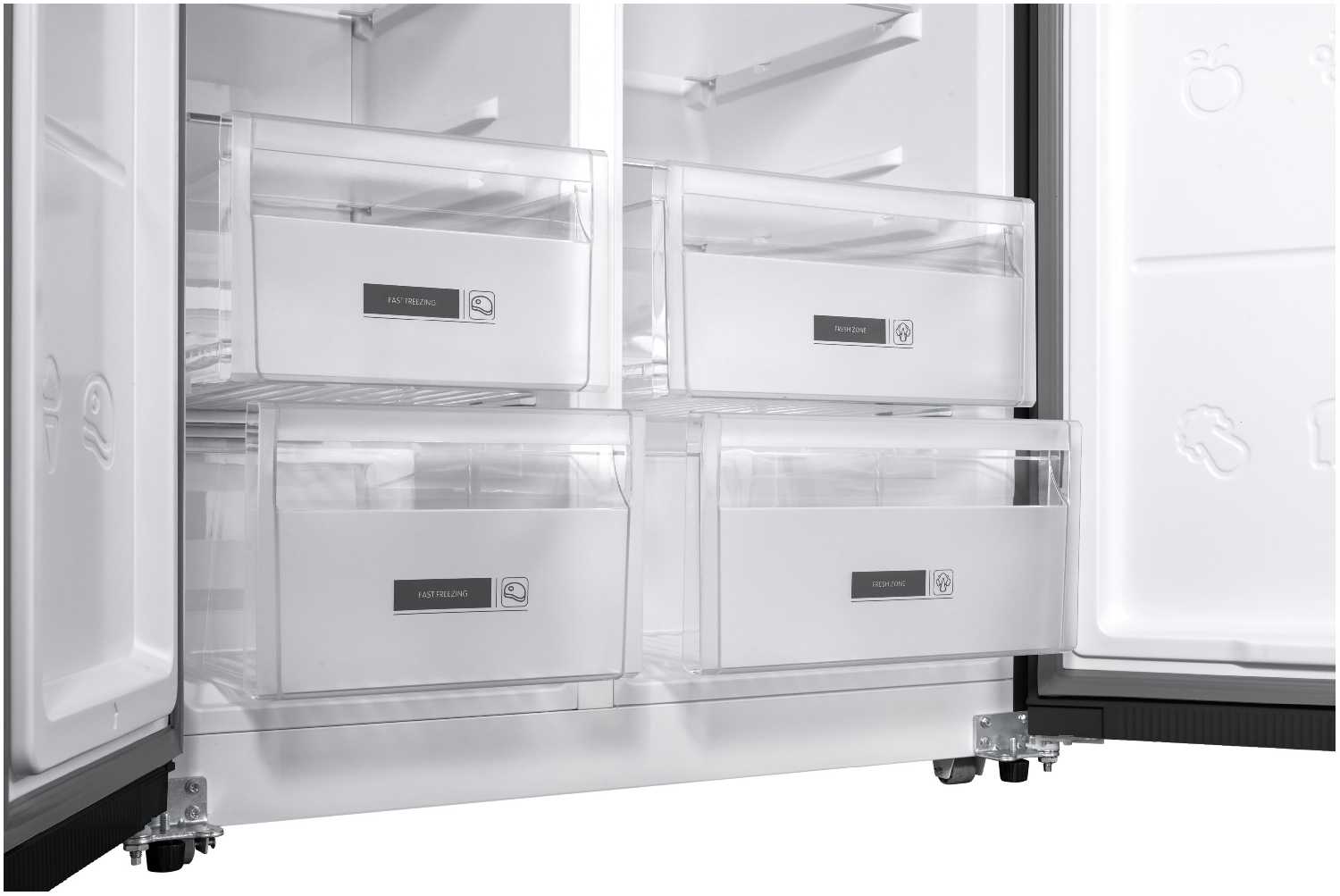 Морозильный отсек организован по системе выдвижных ящиков, что позволяет видеть все содержимое без перекладывания продуктов. Пользователи хвалят вместительность, но отмечают мелкие неудобства: малый размер лотка для льда, недостаток контейнеров в комплекте (их приходится докупать) и туговатые ручки на дверцах. Подсветка в морозилке имеет холодный синий оттенок, который не всем нравится. -