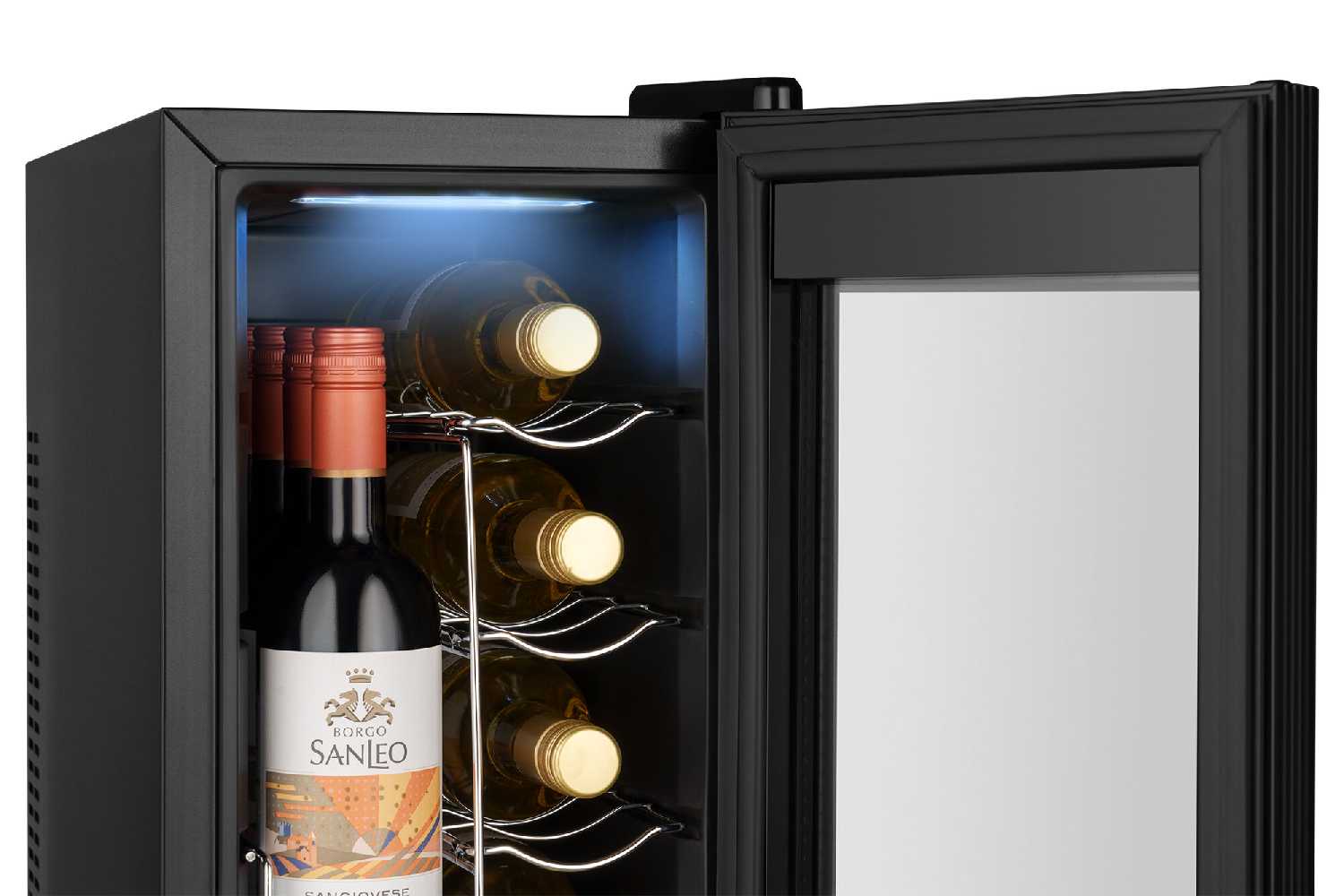 - Рейка выдвигается для легкой загрузки, вмещает 8 стандартных винных бутылок (включая высокие для рислингов).