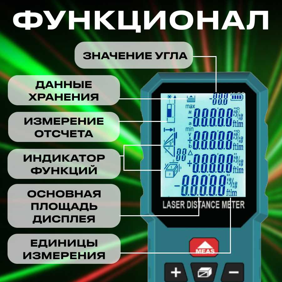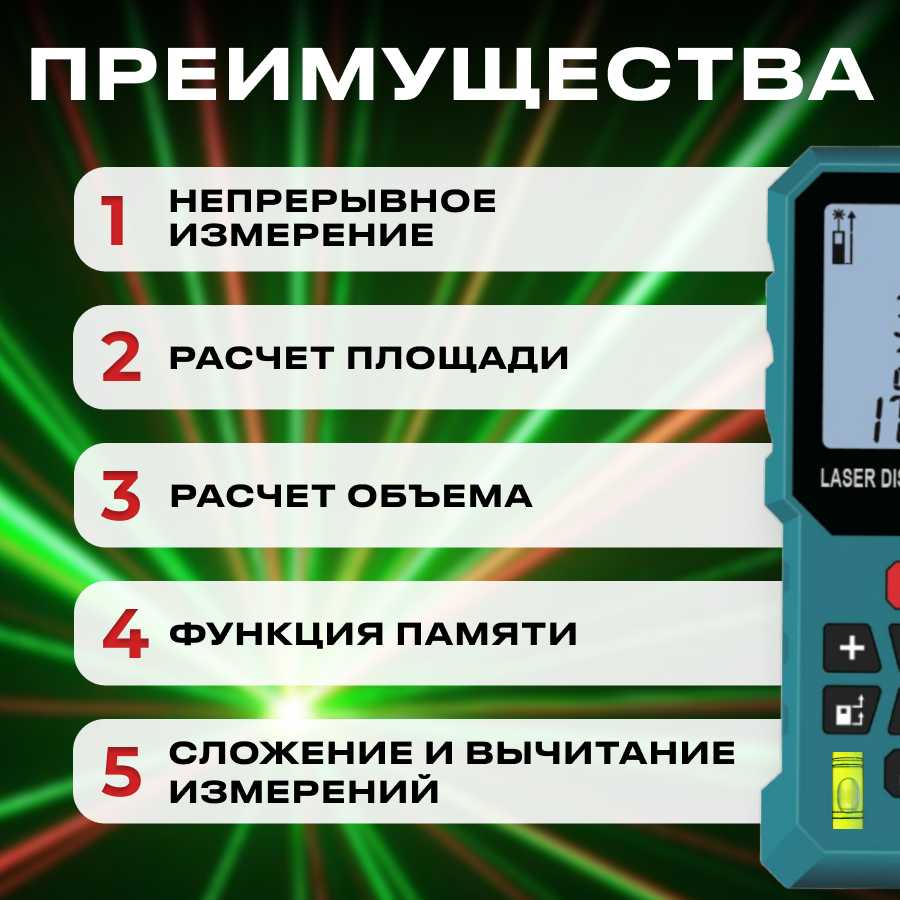 Функции и особенности : | встроенная память, подсветка дисплея, функция расчета объема, функция расчета площади, функция расчета углов, функция сложения/вычитания |