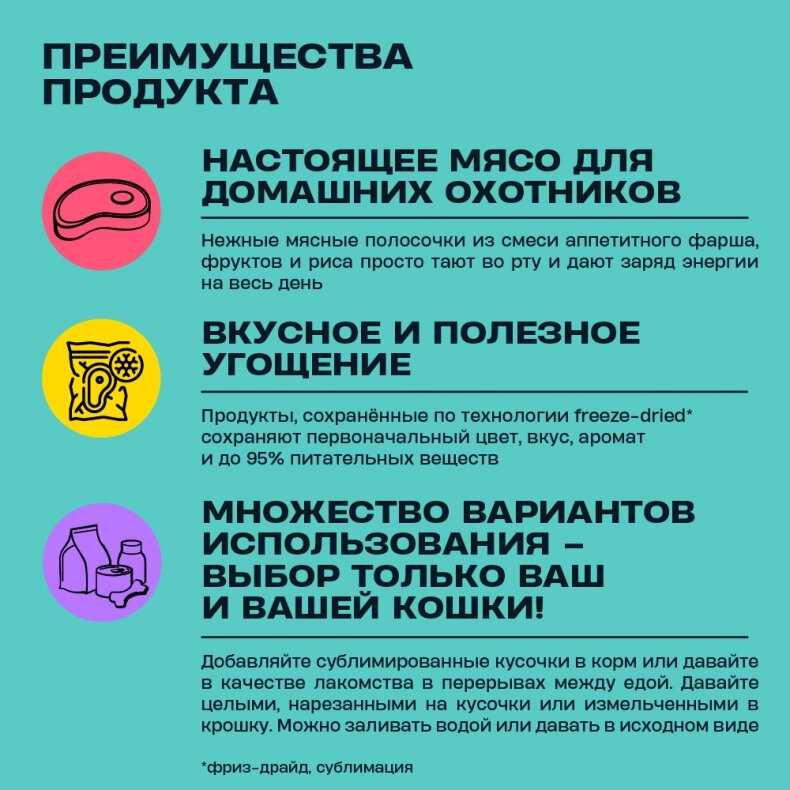 Изготовлено в Татарстане, ООО”ФРИЗ ДРАЙ”. Упаковка приятная, закрывается на велькро. Внутри брусочки 1х2,5х8,5см. Консистенция однородная, помол ингредиентов очень мелкий, как в суфле. Брусочки сухие, воздушные, в упаковке держат форму, но их очень легко покрошить. Запах насыщенный, птица и нотки жира. В жидкости легко набухают, запах становится более насыщенным.