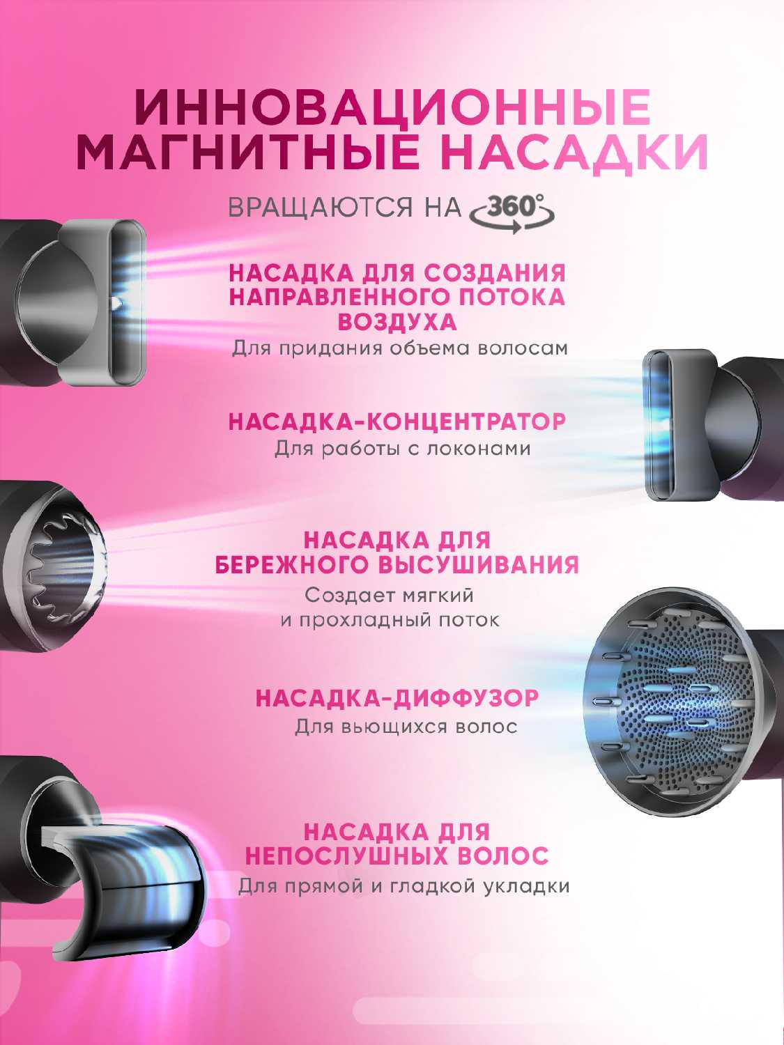 | Насадки : | активный диффузор, диффузор, для бережного высушивания, для выпрямления, для непослушных волос, концентратор, направленный поток |